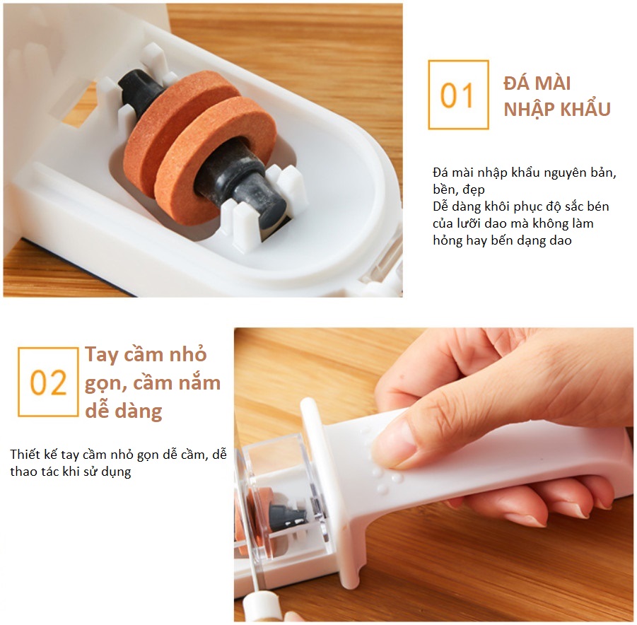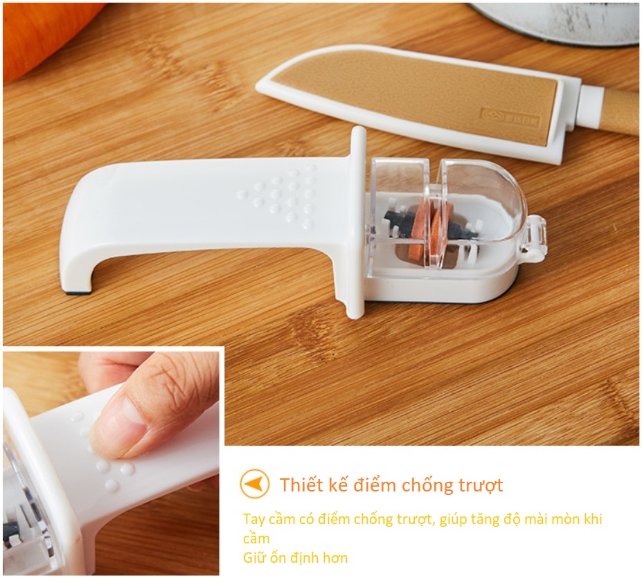 • Dùng để mài sắc dao nhanh chóng, có tay cầm vững chắc không bị trơn trượt, dễ dàng vệ sinh, không bị bám bẩn.