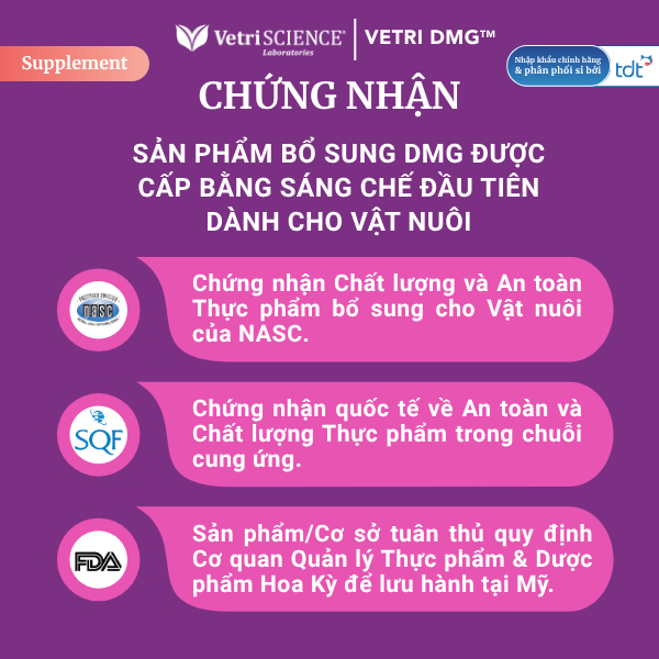 Sản phẩm Vetri DMG chứa thành phần chủ đạo là N,N-Dimethylglycine đóng vai trò như một adaptogen, mang lại hơn 40 lợi ích cho sức khỏe, đặc biệt giúp tăng cường miễn dịch và sức bền của thú cưng.