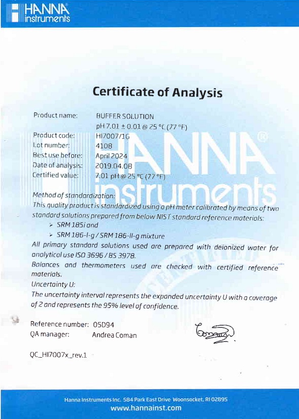 Mua tại TiktokHI7007/1G là một dung dich hiệu chuẩn pH7.01 chất lượng cao NIST và được cung cấp kèm Chứng nhận Phân Tích (COA). Dung dịch hiệu chuẩn Hanna có số lô sản xuất và ngày hết hạn ghi rõ trên nhãn và nắp có vòng bảo vệ để đảm bảo chất lượng. HI7007/1G Độ chính xác @25oC 7.01 ± 0.01 pH Quy cách