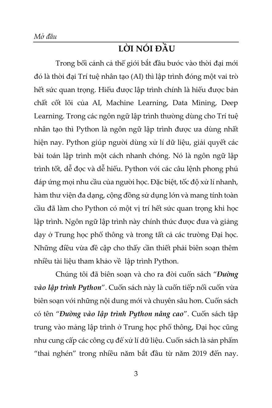 Trong bối cảnh cả thế giới bắt đầu bước vào thời đại mới đó là thời đại Trí tuệ nhân tạo (AI) thì lập trình đóng một vai trò hết sức quan trọng. Hiểu được lập trình chính là hiểu được bản chất cốt lõi của AI, Machine Learning, Data Mining, Deep Learning. Trong các ngôn ngữ lập trình thường dùng cho Trí tuệ nhân tạo thì Python là ngôn ngữ lập trình được ưa dùng nhất hiện nay. Python giúp người dùng xử lí dữ liệu, giải quyết các bài toán lập trình một cách nhanh chóng. Nó là ngôn ngữ lập trình tốt, dễ đọc và dễ hiểu. Python với các câu lệnh phong phú đáp ứng mọi nhu cầu của người học. Đặc biệt, tốc độ xử lí nhanh, hàm thư viện đa dạng, cộng đồng sử dụng lớn và mang tính toàn cầu đã làm cho Python có một vị trí hết sức quan trọng khi học lập trình. Ngôn ngữ lập trình này chính thức được đưa và giảng dạy ở Trung học phổ thông và trong tất cả các trường Đại học. Những điều vừa đề cập cho thấy cần thiết phải biên soạn thêm nhiều tài liệu tham khảo về lập trình Python.