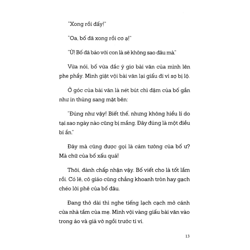 “Trong gia đình mình, mẹ là người có uy nhất. So với bố, mẹ có uy và đáng sợ hơn nhiều. Hôm nay cũng thế, mới sáng sớm đã nghe mẹ cằn nhằn, ồn ào hết cả nhà làm mình rất khó chịu. Trên đường đến trường, mình đã cố nghĩ xem tại sao mẹ lại cằn nhằn như thế, nhưng mẹ nói rất nhiều khiến mình không thể nào nhớ được nguyên nhân làm mẹ cáu. Có điều, mình nghĩ, tức giận là việc của mẹ, còn mình chỉ là chỗ để mẹ trút cơn tức lên thôi.”