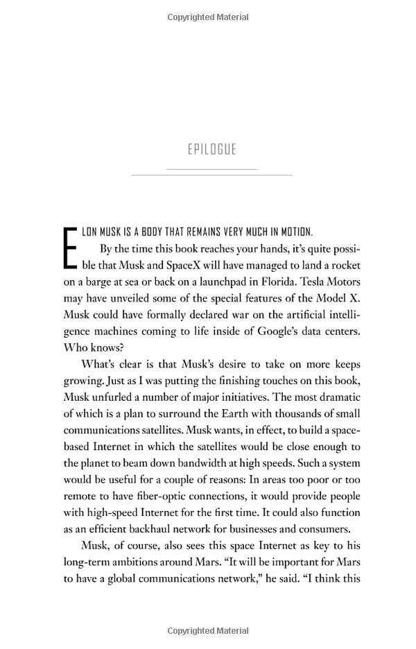 Vance uses Musk's story to explore one of the pressing questions of our time: can the nation of inventors and creators which led the modern world for a century still compete in an age of fierce global competition? He argues that Musk--one of the most unusual and striking figures in American business history--is a contemporary amalgam of legendary inventors and industrialists like Thomas Edison, Henry Ford, Howard Hughes, and Steve Jobs. More than any other entrepreneur today, Musk has dedicated his energies and his own vast fortune to inventing a future that is as rich and far-reaching as the visionaries of the golden age of science-fiction fantasy.