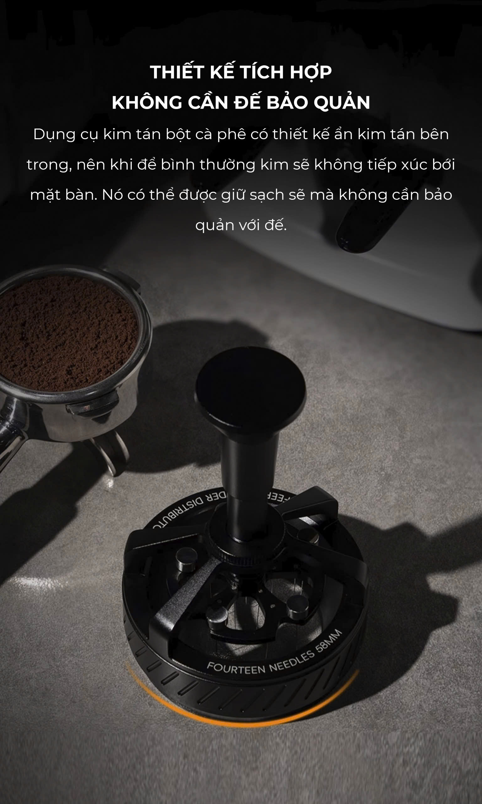️ Hệ thống 14 kim inox 304 siêu mảnh, dày 0,25mm sắp xếp theo 14 vòng tròn đồng tâm, giúp phân bổ bột tối ưu, hạn chế kênh rãnh (channeling).