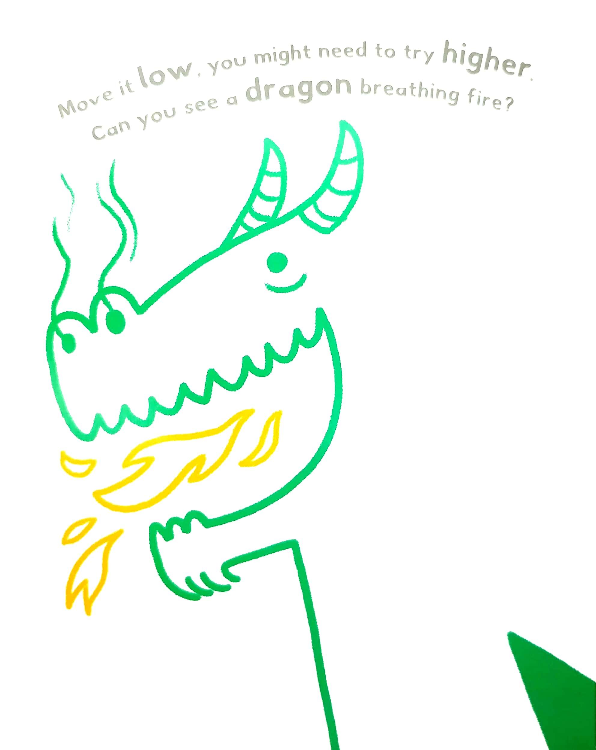 This clever book comes with a shape attached to a ribbon, for manoeuvring around! Read the clues and move the shape around until you complete the picture.What can it be, what can you see?