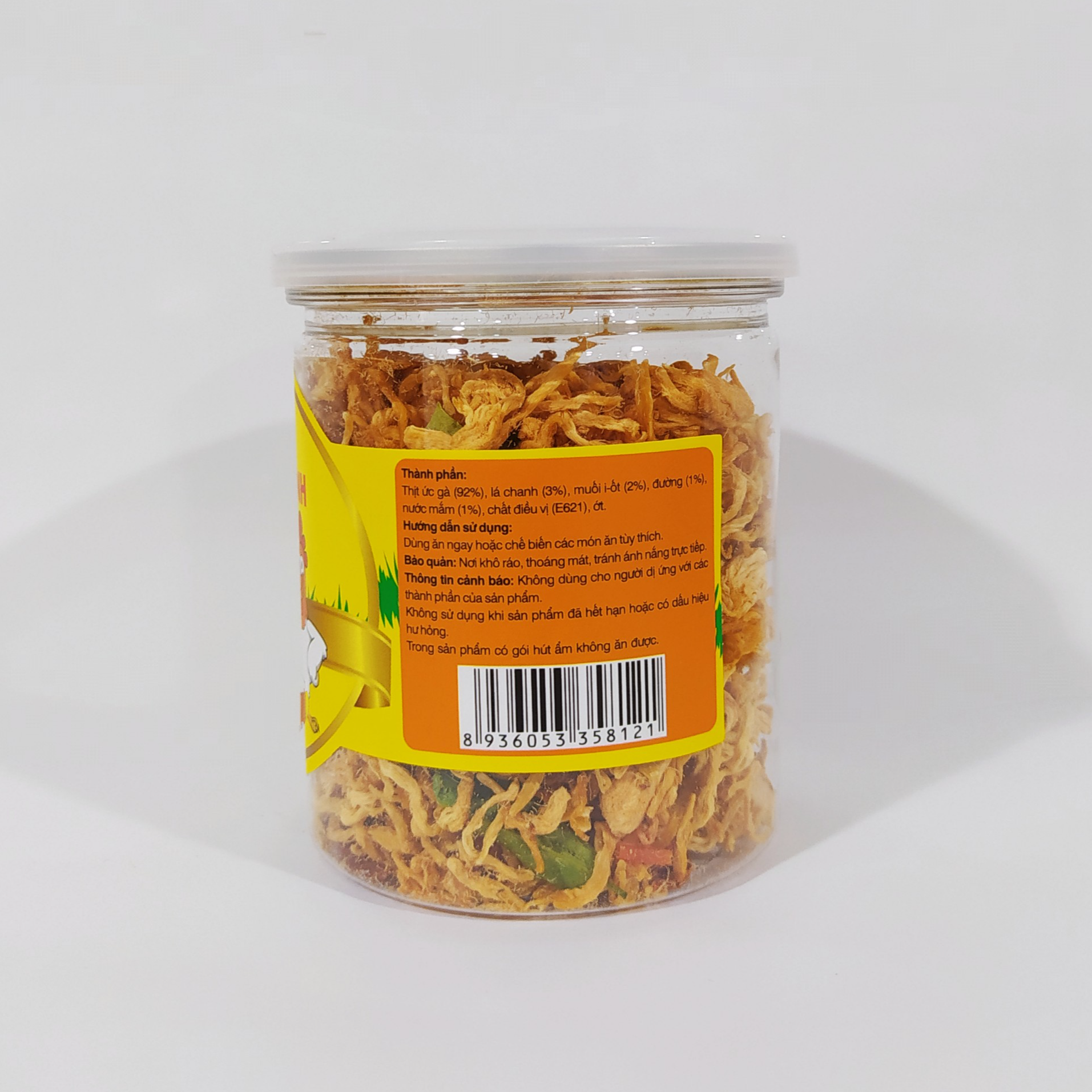 Mua tại TiktokGÀ SẤY LÁ CHANH CHÀ CHÀ - Ngon thật là ngon Thành phần: Thịt ức gà (92%), lá chanh (3%), muối i-ốt (2%), đường (1%), nước mắm (1%), chất điều vị (E621), ớt. Hướng dẫn sử dụng: Dùng ăn ngay hoặc chế biến các món ăn tùy thích. Hướng dẫn bảo quản: Bảo quản nơi khô ráo, thoáng mát, tránh ánh nắng trực tiếp. Hạn sử dụng: 09 tháng kể từ NSX. Ngày sản xuất: Xem dưới đáy hộp. Sản xuất tại Việt Nam Khuyến cáo: Không dùng cho người dị ứng với các thành phần của sản phẩm. Không sử dụng khi sản phẩm đã hết hạn hoặc có dấu hiệu hư hỏng. Trong sản phẩm có gói hút ẩm không ăn được.