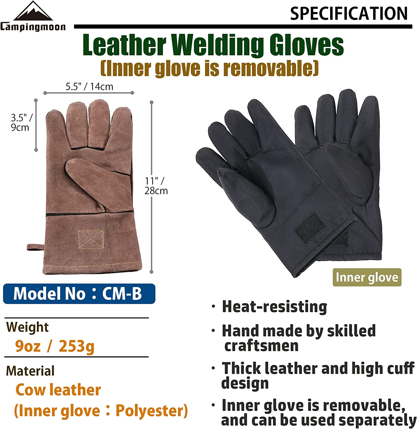 - Chất liệu: Da đã xử lý, polyester và coton Găng tay chịu nhiệt Campingmoon Q28 được hoàn thiện bằng tay bởi những người thợ thủ công lành nghề. Có lúc muốn bảo vệ đôi tay của mình khi đi cắm trại, chẳng hạn như chặt củi bằng dao hoặc rìu, và đặt than hoặc củi trên đống lửa nóng. Găng tay dễ dàng di chuyển các ngón tay của bạn, nó không chỉ phù hợp chống nóng để đốt củi mà còn phù hợp với nhiều công việc như nhặt củi, chặt củi và nấu ăn. Nếu bỏ lớp găng bên trong sẽ thấy độ dày vừa phải. Ngoài ra, bạn có thể điều chỉnh độ vừa vặn tùy thuộc vào việc bạn có đeo lớp bên trong hay không. Bên trong là polyester và coton sử dụng vật liệu chống cháy. Đường cắt và thiết kế dày dặn nhưng linh hoạt và dễ dàng di chuyển. Bền và lâu dài. Hoàn hảo cho đốt lửa trại và tiệc nướng! Có thể tháo rời bên trong với khóa dán. Cố định găng tay bên trong và bên ngoài bằng khóa dán để chống trượt trong quá trình làm việc. Bạn chỉ có thể lấy găng tay bên trong ra và giặt.