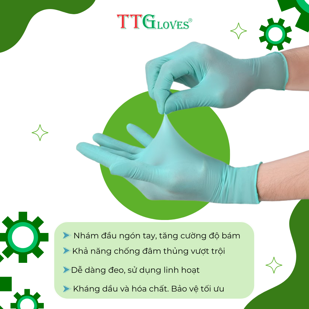 Găng Tay Y Tế, Bao Tay Cao Su Y Tế Không Bột Nitrile TTGLOVES Siêu Dai Màu Xanh Lá Độc Đáo 3.5g 100 Chiếc Size M THÔNG TIN SẢN PHẨM + Tên sản phẩm: