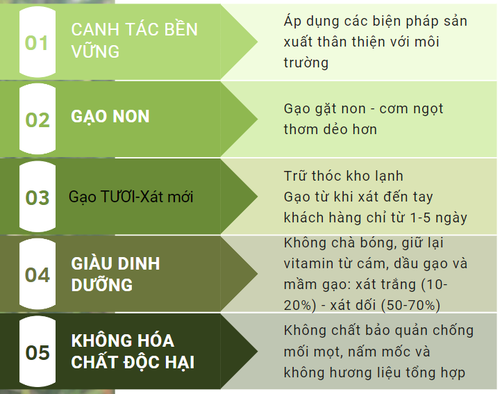 - Gạo tươi: gạo tươi giữ được độ ẩm và giá trị dinh dưỡng vì gặt đúng mùa vụ + thời hạn sử dụng ngắn (2 tháng) + xát theo yêu cầu + giữ cám