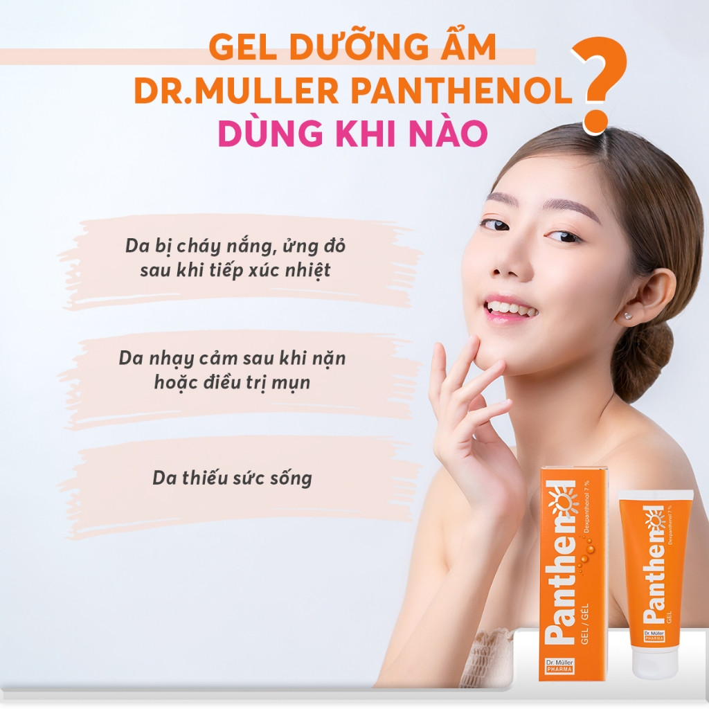 Mua tại TiktokGel dưỡng da phục hồi Panthenol của Dr.Muller có dạng gel sữa dịu nhẹ, thẩm thấu nhanh, không nhờn dính và dịu nhẹ cho mọi làn da, phù hợp với da bị cháy nắng, da đỏ sau khi tiếp xúc nhiệt, da sau trị mụn/nặn mụn, da thiếu sức sống. Sản phẩm phù hợp cho người lớn va trẻ nhỏ từ 12 tháng tuổi trở lên. Hộp 1 tuýp 100ml CÔNG DỤNG:
