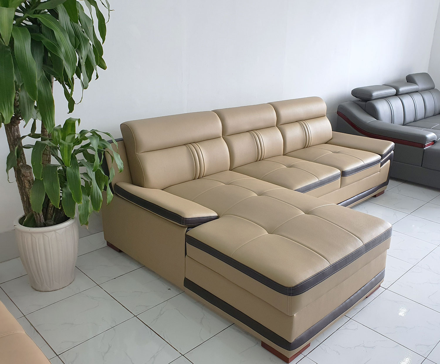 Có được một bộ ghế đẹp cho phòng khách là điều ai cũng mong muốn. Để đáp ứng nhu cầu của khách hàng chúng tôi đã cho ra đời bộ sofa với thiết kế mới nhất, mang đậm hiện đại, đẹp mắt. Bộ sofa này màu kem có viền màu nâu đen, lưng ghế có 2 đường may ở giữa chạy dọc tạo điểm nhấn, mặt ngồi của ghế được may rút nút nên khi nằm sẽ đỡ bị nóng hơn. Ghế sofa da công nghiệp cao cấp được thiết kế đơn giản theo góc nhà tạo thành hình chữ L giúp tiết kiệm diện tích và tận dụng được các góc chết của căn phòng. Tiện lợi cho cả việc tiếp khách lẫn thư giãn, đọc sách, xem phim,