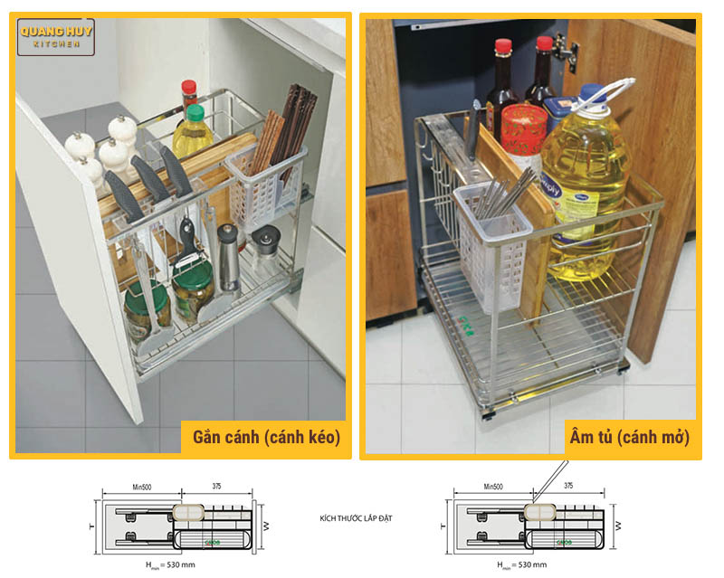 Lắp gắn cánh bạn chỉ cần kéo cánh tủ là đồng thời kéo giá dao thớt ra luôn. Giá được bắt trực tiếp vào cánh tủ