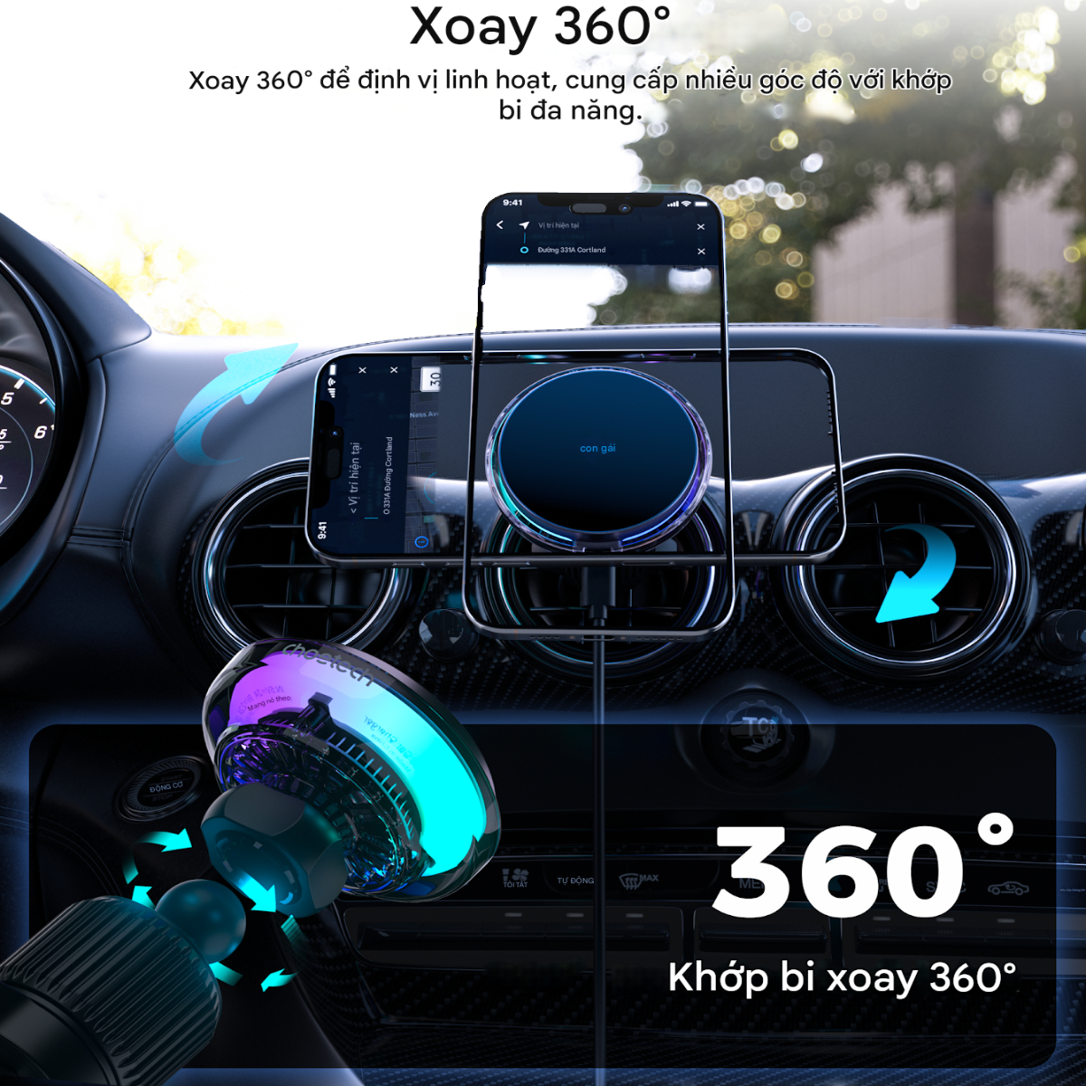 - Đèn LED đổi màu cực ngầu – Cá tính hơn mỗi chuyến đi – Vòng LED đổi màu tự động mang lại hiệu ứng ánh sáng sang trọng, tinh tế và nổi bật vào ban đêm. Vừa giúp bạn dễ nhận diện vị trí sạc, vừa tăng thêm nét hiện đại cho không gian nội thất xe. Hình ảnh Giá đỡ điện thoại Magnetic 15W Choetech T233-F chuẩn Qi2 với đèn LED đổi màu (Hàng chính hãng).