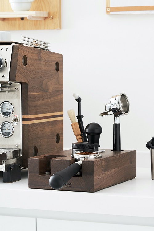GIÁ ĐỠ TAMPER BẰNG GỖ TỰ NHIÊN PHA CÀ PHÊ MÁY ESPRESSO CAFE DE KONA Khối gỗ được làm bằng 2 loại gỗ: gỗ óc chó đen và gỗ giẻ gai châu âu.