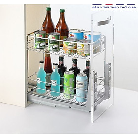 Giá đa năng để giao thớt, chai lọ, gia vị Chất liệu: Inox 304 dạng nan tròn Phiên bản bắt cánh ngăn kéo và mở cánh Ray âm giảm chấn Angas Độ rộng cánh: 300mm