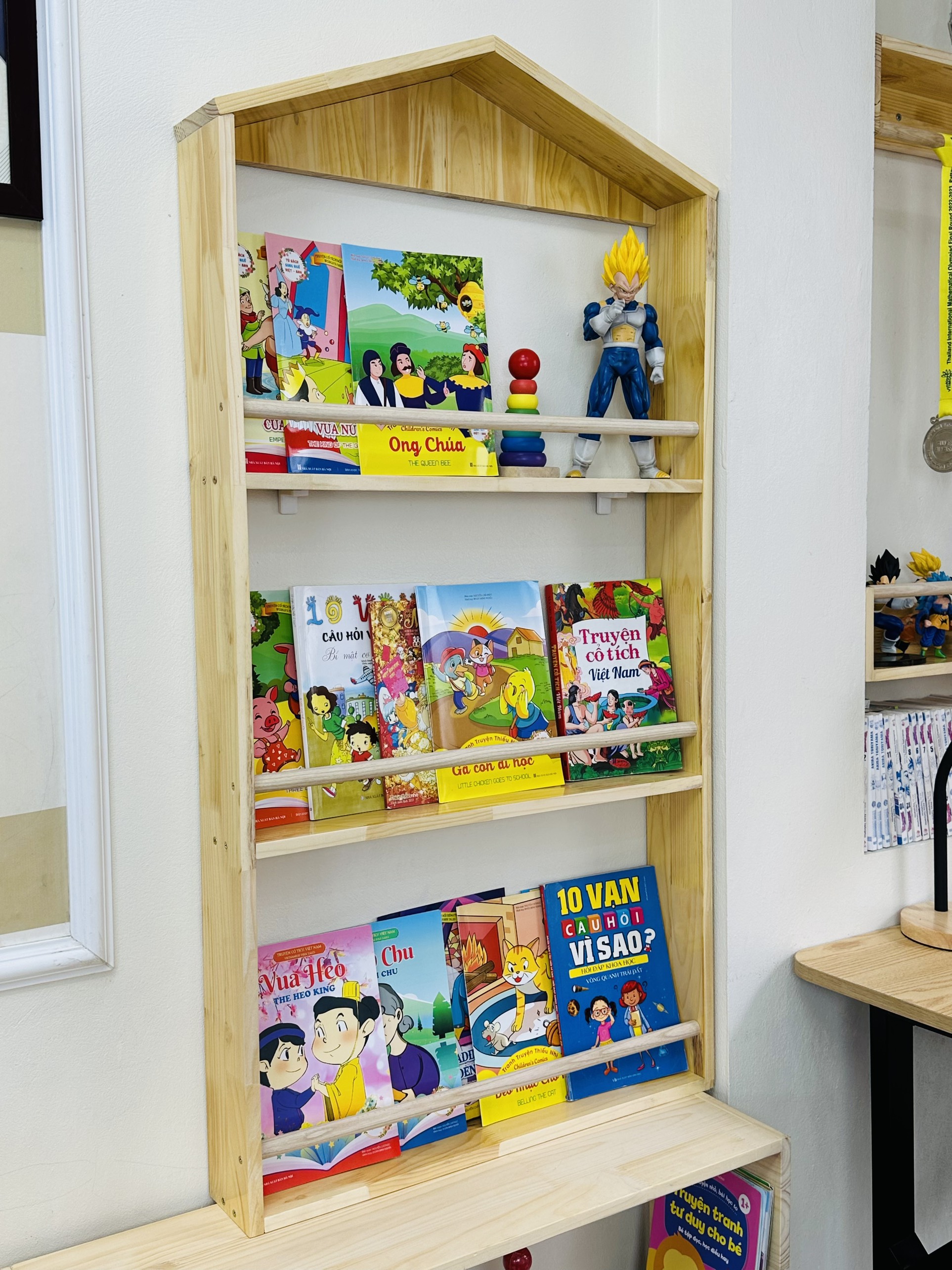 KỆ SÁCH ĐƯỢC SẢN XUẤT TRỰC TIẾP TẠI XƯỞNG BENRIKIDS-QUÝ ĐỐI TÁC THẦY CÔ TRƯỜNG MẦM NON MUỐN LÀM Kệ được chế tạo từ gỗ thông nhập khẩu trơn mịn an toàn không như gỗ