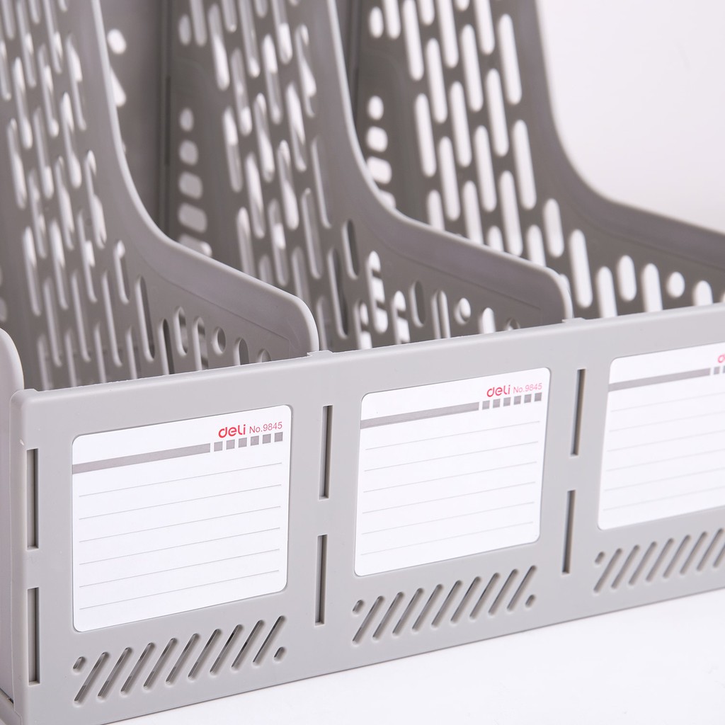 Khay Tài Liệu Nhựa 3 Ngăn Deli 9845 được thiết kế 3 ngăn dạng đứng, phù hợp để lưu trữ các loại tài liệu hoặc các dụng cụ văn phòng phẩm khác. Các chi tiết nhựa