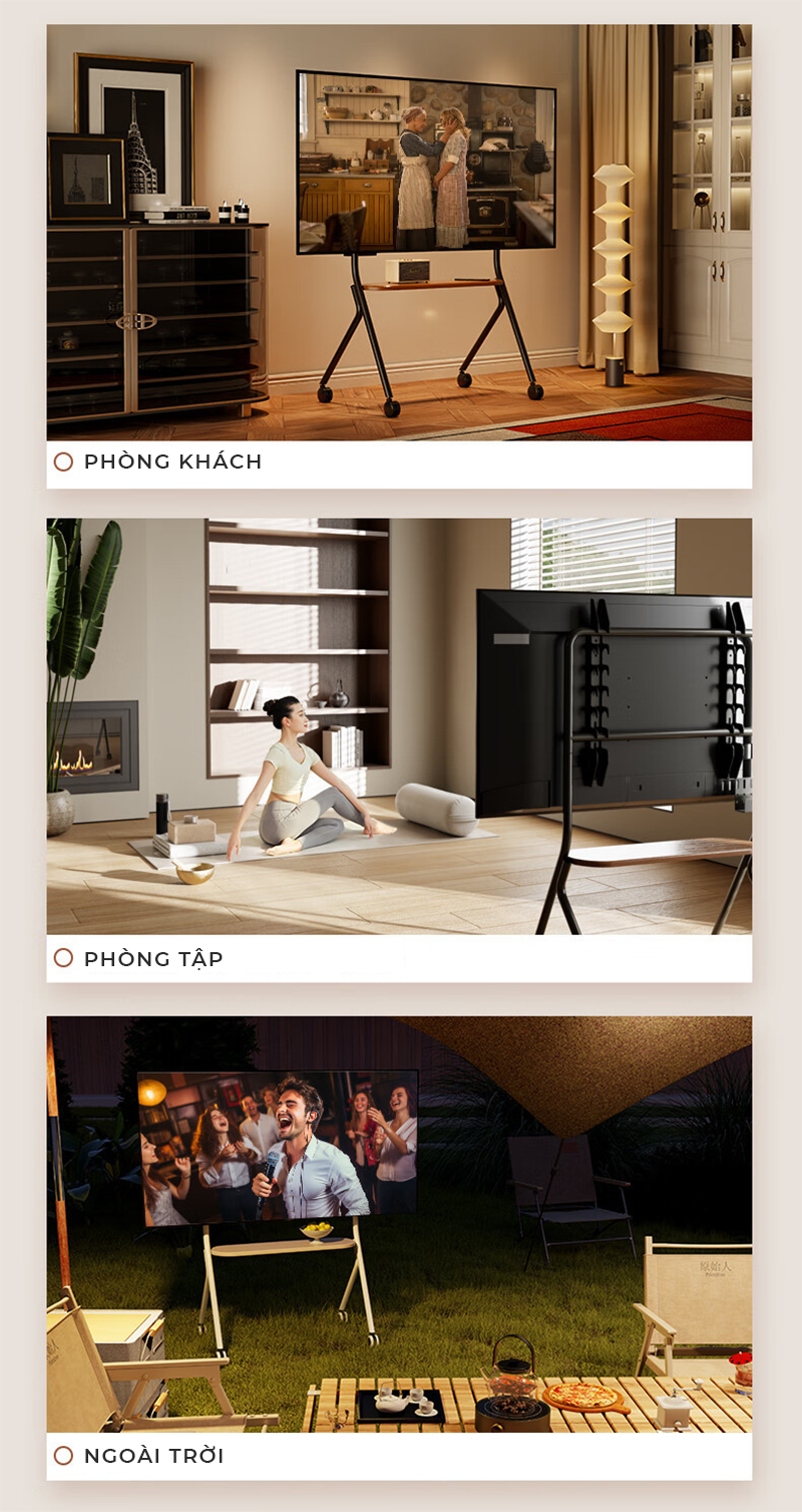 Công năng: Là mẫu giá treo tivi di động kèm kệ để đồ tiện lợi phù hợp nhiều không gian như phòng khách, phòng ngủ, phòng họp, phòng cộng đồng, ..