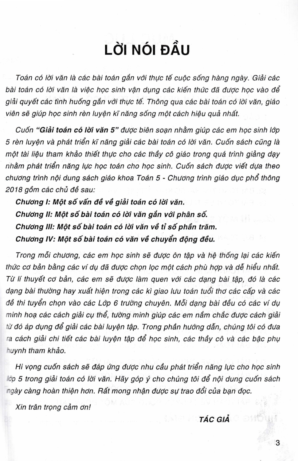 Mua tại TiktokGiải Toán Có Lời Văn 5 (Dùng Chung Cho Các Bộ SGK Hiện Hành) Toán có lời văn là các bài toán gắn với thực tế cuộc sống hàng ngày. Giải các bài toán có lời văn là việc học sinh vận dụng các kiến thức đã được học vào để giải quyết các tình huống gắn với thực tế. Thông qua các bài toán có lời văn, giáo viên sẽ giúp học sinh rèn luyện kĩ năng sống một cách hiệu quả nhất. Cuốn “Giải toán có lời văn 5" được biên soạn nhằm giúp các em học sinh lớp 5 rèn luyện và phát triển kĩ năng giải các bài toán có lời văn. Cuốn sách cũng là một tài liệu tham khảo thiết thực cho các thầy cô giáo trong quá trình giảng dạy nhằm phát triển năng lực học toán cho học sinh. Cuốn sách được viết dựa theo chương trình nội dung sách giáo khoa Toán 5 - Chương trình giáo dục phổ thông 2018 gồm các chủ đề sau: Chương 1: Một số vấn đề về giải toán có lời văn. Chương II: Một số bài toán có lời văn gắn với phân số. Chương III: Một số bài toán có lời văn về tỉ số phần trăm. Chương IV: Một số bài toán có văn về chuyển động đều. Trong mỗi chương, các em học sinh sẽ được ôn tập và hệ thống lại các kiến thức cơ bản bằng các ví dụ đã được chọn lọc một cách phù hợp và dễ hiểu nhất. Từ lí thuyết cơ bản, các em sẽ được làm quen với các dạng bài tập, đó là các dạng bài thường hay xuất hiện trong các kì giao lưu toán tuổi thơ các cấp và các để thi tuyển chọn vào các Lớp 6 trường chuyên. Mỗi dạng bài đều có các ví dụ minh hoạ các cách giải cụ thể, tường minh giúp các em nắm chắc được cách giải từ đó áp dụng để giải các bài luyện tập. Trong phần hướng dẫn, chúng tôi có đưa ra cách giải chi tiết các bài luyện tập để học sinh, các thầy cô và các bậc phụ huynh tham khảo. Hi vọng cuốn sách sẽ đáp ứng được nhu cầu phát triển năng lực cho học sinh lớp 5 trong giải toán có lời văn. Hãy góp ý cho chúng tôi để nội dung cuốn sách ngày càng hoàn thiện hơn. Rất mong nhận được sự trao đổi của bạn đọc.