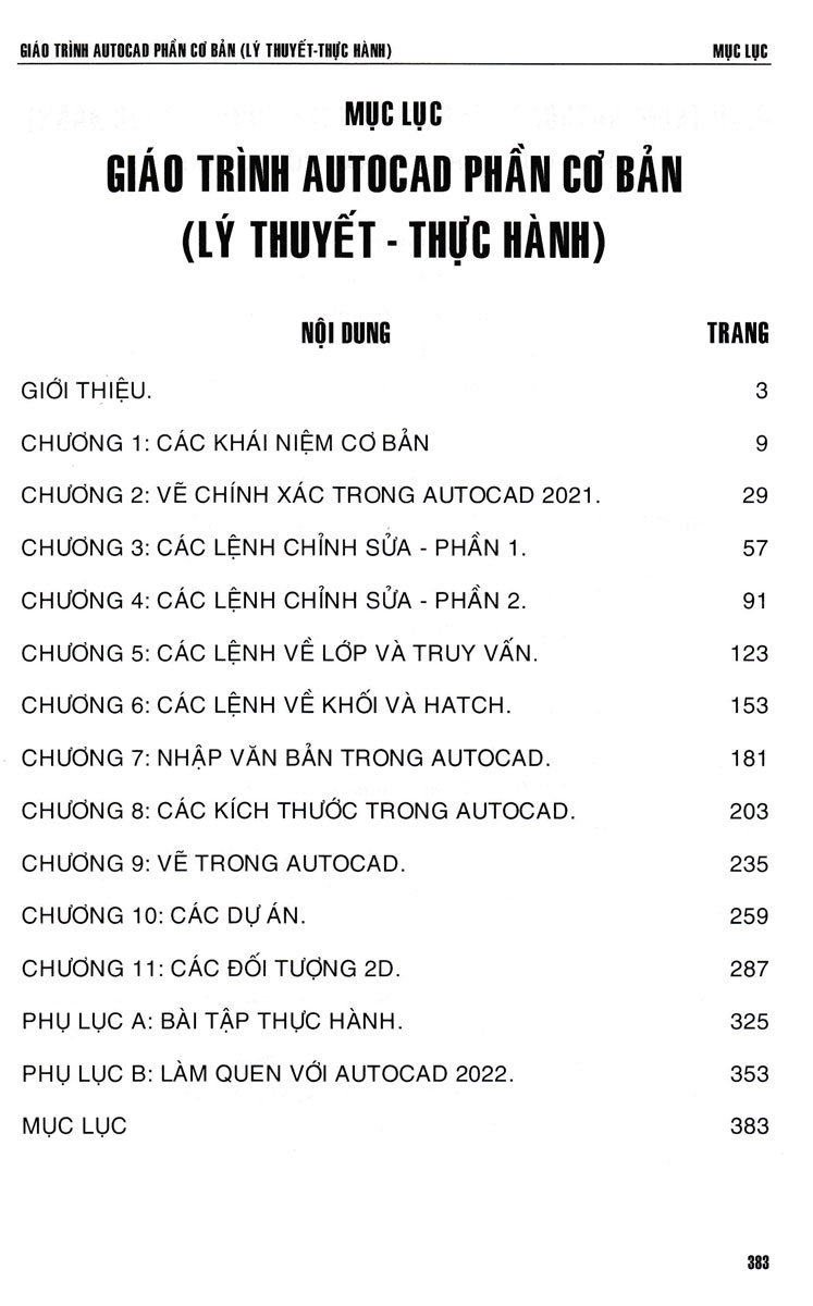 Trong đó 4 cuốn đầu trình bày cả lý thuyết và bài tập, quyển thứ năm trình bày chủ yếu là bài tập thực hành. Các tập từ 1 đến 5 được thực hiện trên phiên bản AutoCAD 2021, tập 6 thực hiện trên phiên bản mới nhất của AutoCAD đó là AutoCAD và AutoCAD 3D 2022.
