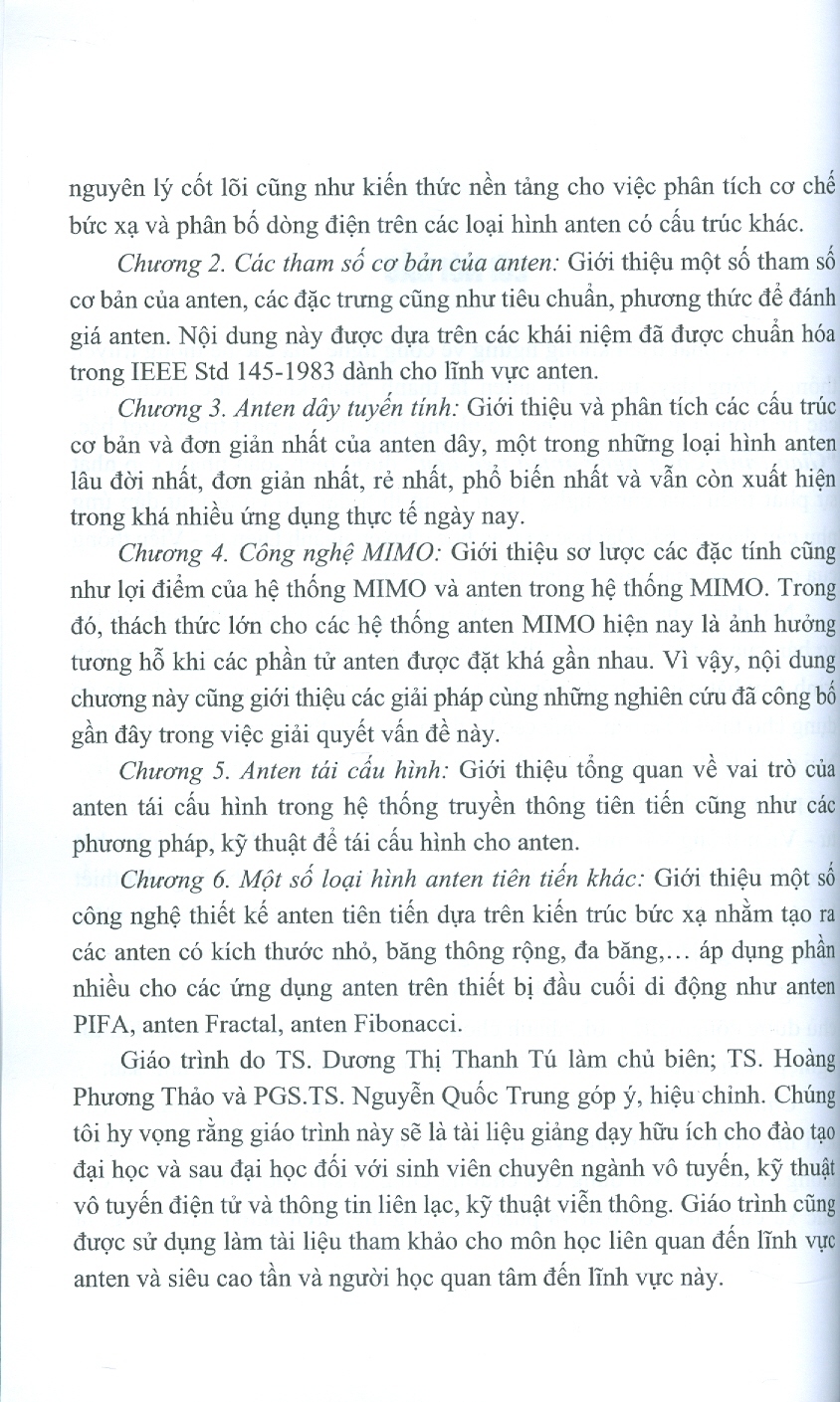 Nội dung của giáo trình giới thiệu một cách tổng quát các nguyên tắc cơ bản của anten đến các hệ thống anten thông minh, tiên tiến. Giáo trình trình bày bắt đầu từ lý thuyết đến nguyên lý cũng như các nguyên tắc áp dụng cho thiết kế anten trong các hệ thống truyền thông vô tuyến hiện nay. Nội dung lý thuyết trong mỗi chương đều bao gồm các công thức toán học với phân tích chi tiết, minh họa cụ thể để các sinh viên chuyên ngành Điện tử - Viễn thông với mức học trung bình trở lên có thể đọc hiểu, nắm bắt được kiến thức và không quá khó khăn trong việc phân tích cũng như thiết kế các loại hình anten cơ bản. Bên cạnh đó, với kinh nghiệm là sinh viên, kỹ sư, giảng viên, nhóm tác giả mong muốn tiên phong trong việc cập nhật những tiến bộ trong công nghệ anten tiên tiến, giúp sinh viên có thể làm chủ được công nghệ mới, nhanh chóng bắt kịp được công việc sau khi tốt nghiệp.
