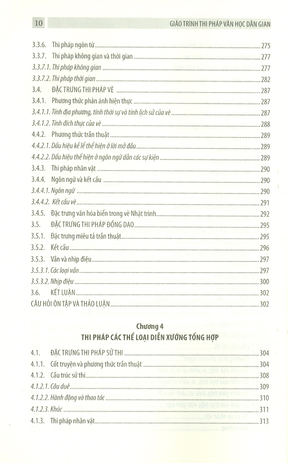 Giáo trình được cấu trúc thành bốn chương, chương 1 nêu những đặc trưng chung của thi pháp văn học dân gian, chương 2, 3, 4 là các phần đi vào đặc trưng thi pháp của các thể loại văn học dân gian. Chúng tôi chia thi pháp các thể loại văn học dân gian theo chức năng diễn xướng. Trong chương 4, chúng tôi trình bày thêm thi pháp của thể loại chèo và tuồng mà tất cả các giáo trình thi pháp hiện hành chưa đề cập đến.