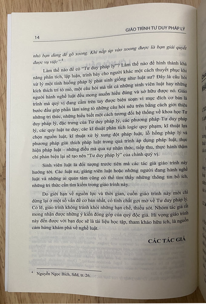 Giáo trình này không chỉ dừng lại ở việc cung cấp tri thức về Tư duy pháp lý, mà còn có vai trò, nhiệm vụ quan trọng trong việc hình thành, bồi dưỡng cho sinh viên năng lực phát hiện vấn đề, năng lực phân tích, phản biện, lập luận và xử lý các tình huống phát sinh trong hoạt động áp dụng pháp luật, thực hiện pháp luật.