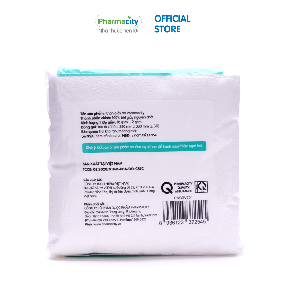 Giấy ăn Pharmacity mềm mại, dai và thấm hút, phù hợp để sử dụng trong bữa ăn hoặc lau sạch các bề mặt, đảm bảo vệ sinh trong bữa ăn hàng ngày. Thành phần: 100% bột