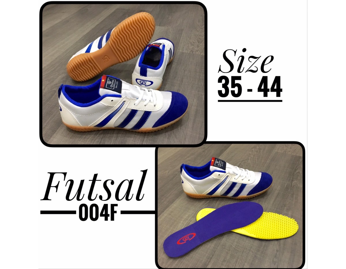 GIÀY ĐÁ BÓNG FUTSAL ( SIZE 37 ĐẾN 44) 004F là sản phẩm được thiết kế cho các cầu thủ đá sân Futsal trong nhà, sân gỗ, sân si măng và các môn thể thao