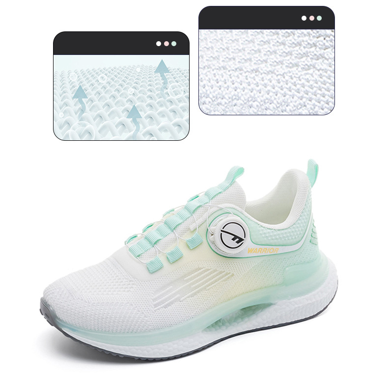 Đế giày - lựa chọn chất liệu Phylon làm nên đế giày thể thao cho các chị em. Vì tính chất nổi bật của vật liệu này là trọng lượng siêu nhẹ (nặng chỉ 300g/chiếc) và độ đàn hồi cao. Nhờ đó, phần lớn khách hàng sử dụng sản phẩm ngay từ lần đầu tiên đều có cảm giác đôi chân “nhẹ như bay”, bước đi thoải mái và thỏa thích vận động ở mọi tư thế theo cách riêng mà không lo đau mỏi chân. - Mặt đế thiết kế thêm những rãnh chống trượt, bố trí dày đặc nhằm tăng độ ma sát. Qua đó giúp người mang vận động thoải mái, bước đi vững chắc và bảo đảm an toàn tối đa, nhất là khi di chuyển trên những địa hình trơn nhẵn hoặc thời tiết ẩm ướt. Thân giày - Thân giày áp dụng công nghệ đan 2 sợi độc đáo. Nhờ vậy, sản phẩm vô cùng nhẹ và thoáng, mang lại cảm giác thoải mái nhất có thể cho người sử dụng. Không những vậy, công nghệ đan 2 sợi còn bảo đảm độ bền chặt của từng chi tiết như cổ giày, quai giày, dây giày… giữ đúng form dáng lâu dài, ít biến dạng hoặc giãn sau một thời gian sử dụng. - Bên cạnh đó, thiết kế thân giày được cải tiến mạnh mẽ bằng chất liệu vải canva, bảo đảm cảm giác thoải mái nhất có thể và hạn chế nóng bức, bí bách nếu phải mang giày trong thời gian dài. -