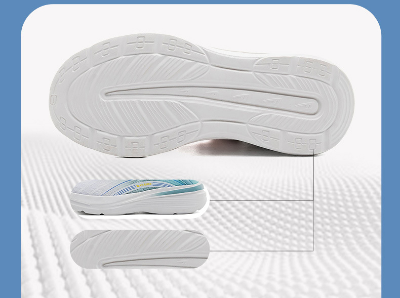 Đế giày - lựa chọn chất liệu Phylon làm nên đế giày thể thao cho các chị em. Vì tính chất nổi bật của vật liệu này là trọng lượng siêu nhẹ (nặng chỉ 300g/chiếc) và độ đàn hồi cao. Nhờ đó, phần lớn khách hàng sử dụng sản phẩm ngay từ lần đầu tiên đều có cảm giác đôi chân “nhẹ như bay”, bước đi thoải mái và thỏa thích vận động ở mọi tư thế theo cách riêng mà không lo đau mỏi chân. - Mặt đế thiết kế thêm những rãnh chống trượt, bố trí dày đặc nhằm tăng độ ma sát. Qua đó giúp người mang vận động thoải mái, bước đi vững chắc và bảo đảm an toàn tối đa, nhất là khi di chuyển trên những địa hình trơn nhẵn hoặc thời tiết ẩm ướt. Thân giày - Thân giày áp dụng công nghệ đan 2 sợi độc đáo. Nhờ vậy, sản phẩm vô cùng nhẹ và thoáng, mang lại cảm giác thoải mái nhất có thể cho người sử dụng. Không những vậy, công nghệ đan 2 sợi còn bảo đảm độ bền chặt của từng chi tiết như cổ giày, quai giày, dây giày… giữ đúng form dáng lâu dài, ít biến dạng hoặc giãn sau một thời gian sử dụng. - Bên cạnh đó, thiết kế thân giày được cải tiến mạnh mẽ bằng chất liệu vải canva, bảo đảm cảm giác thoải mái nhất có thể và hạn chế nóng bức, bí bách nếu phải mang giày trong thời gian dài. -
