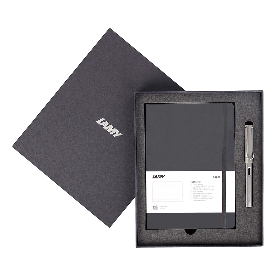 Bộ quà tặng LAMY Gift set Notebook Softcover A5 đi kèm một chiếc bút máy LAMY Al-star vỏ nhôm tinh tế. Tất cả được đặt trong một hộp quà LAMY sang trọng, thích hợp làm