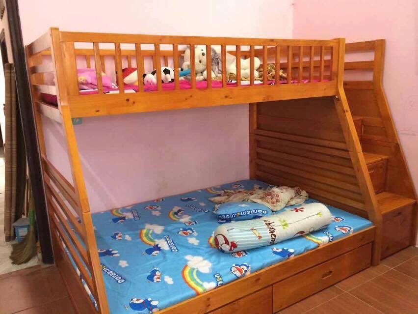 + Chất liệu: Khung giường gỗ thông Newzealand, phân tầng, Vách, đáy hộc gỗ công nghiệp, thang giường MDF chịu lực + Kích thước: kích thước phủ bì, tầng trên ưới 1mx2m Giường tầng hộp