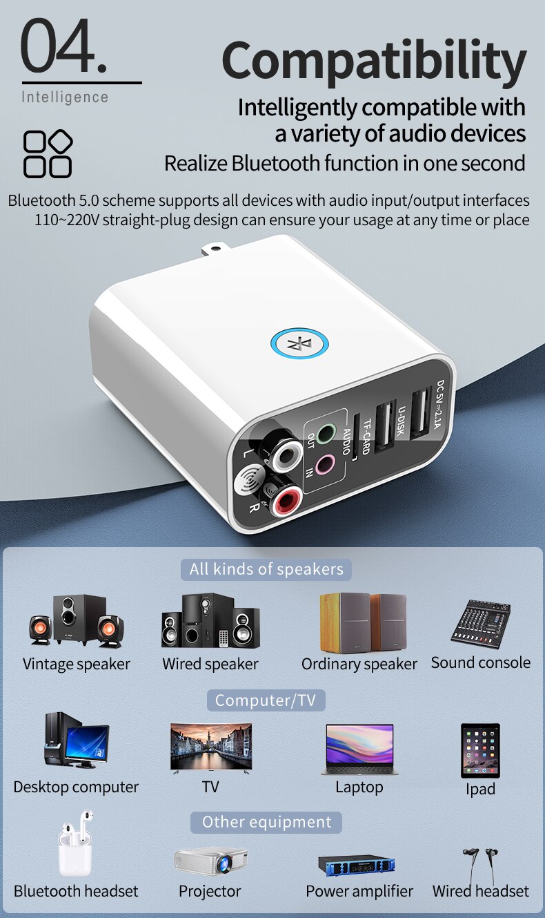 - Biến bất kỳ thiết bị nào thành nguồn phát nhạc Bluetooth: điện thoại, máy tính bảng, laptop,