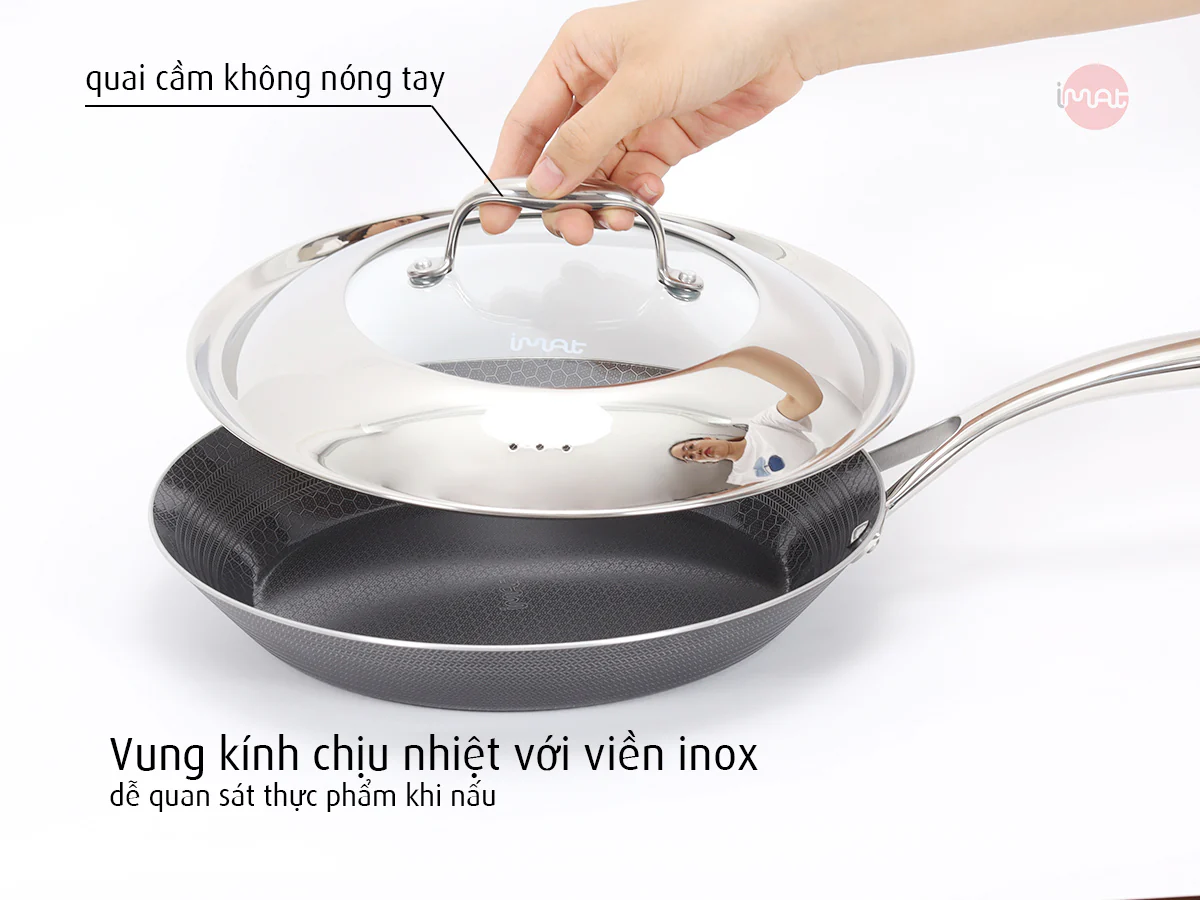Vung kính chịu nhiệt với viền inox to: Giúp quan sát thực phẩm trong khi nấu.