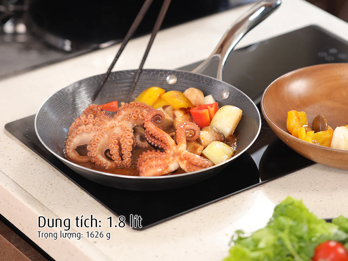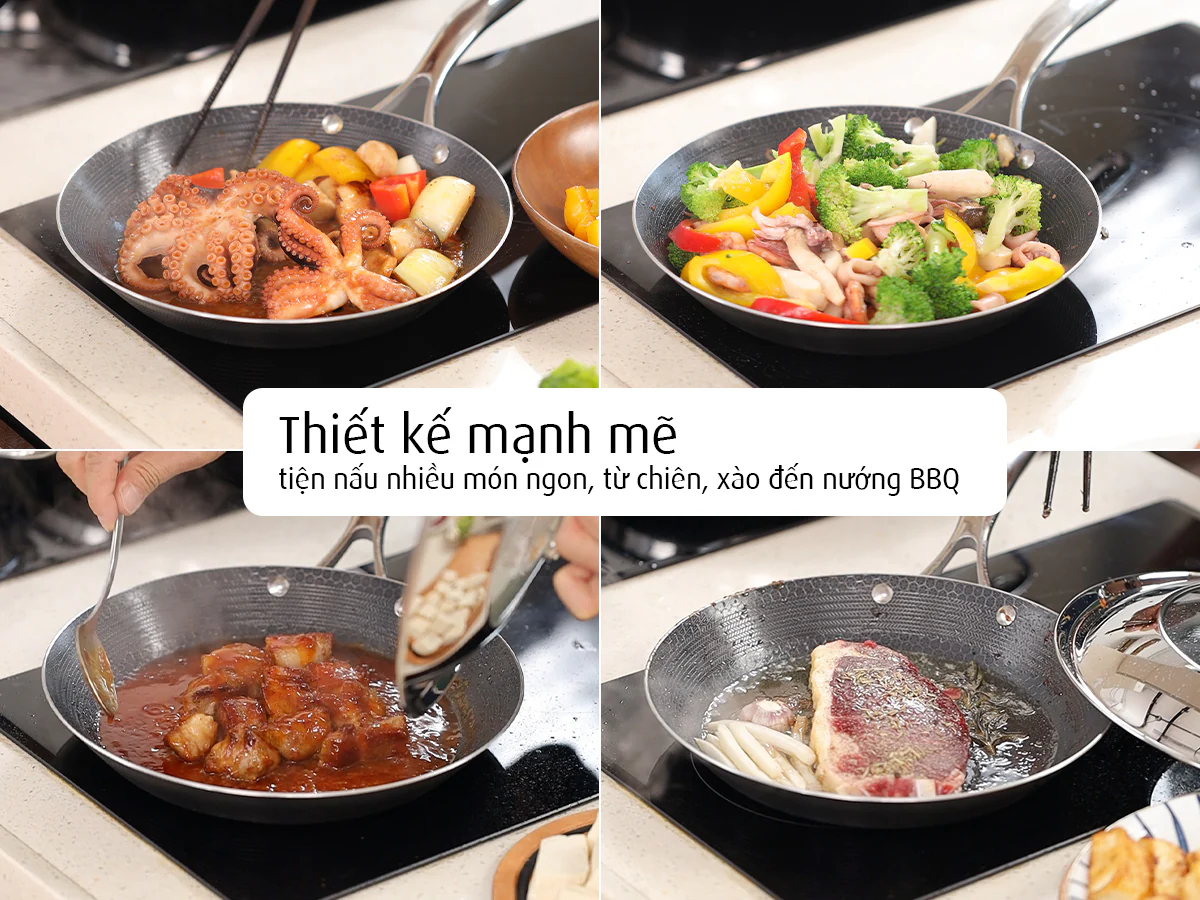 Tay cầm inox lạnh tay: Tay cầm dài, chắc chắn, không nóng trong quá trình nấu.