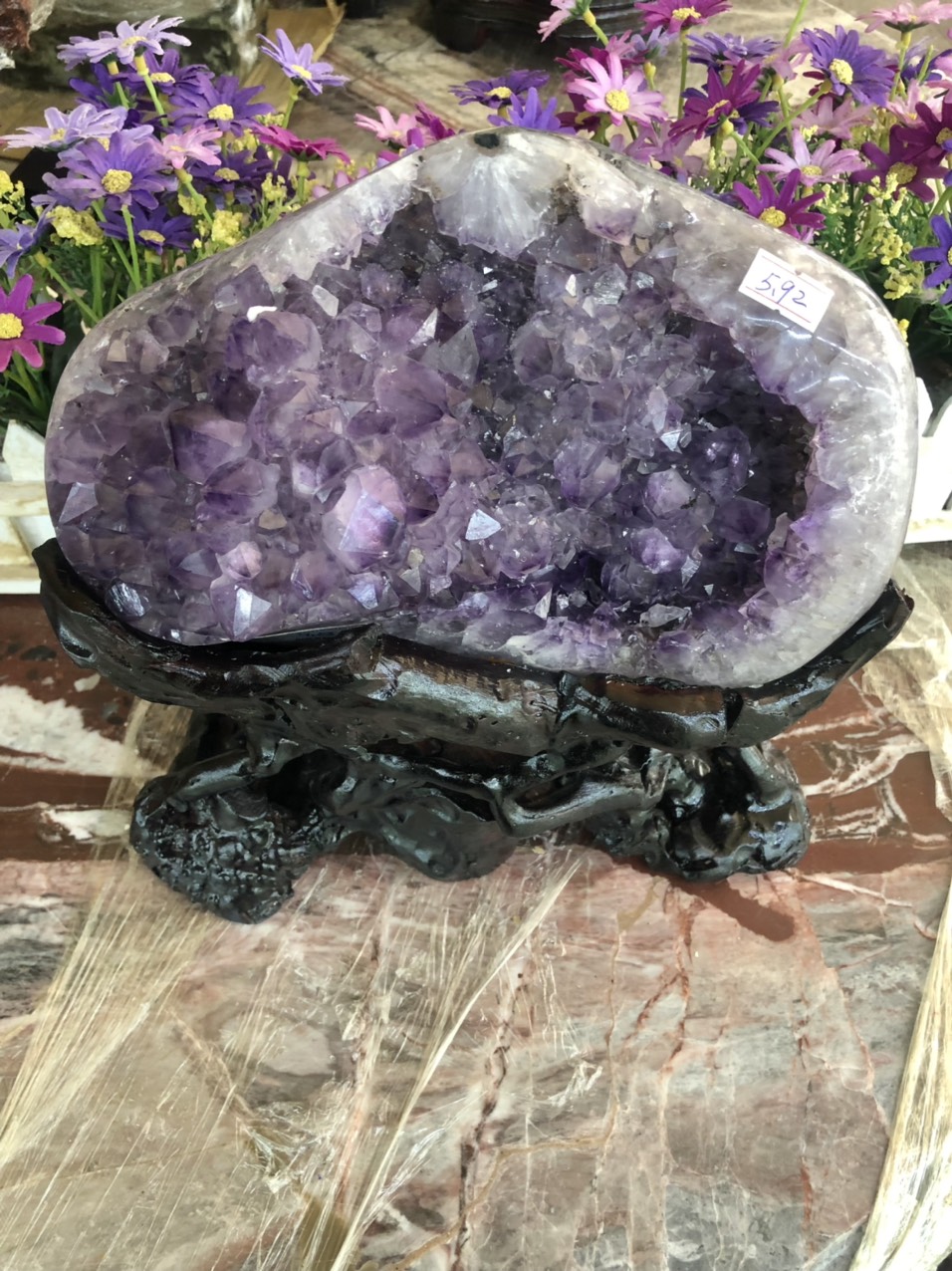 Hốc thạch anh tím - động thạch anh tím là sự kết tinh của các tinh thể thạch anh tím nhỏ li ti sáng lấp lánh được bao bọc bởi lớp đá thô bên ngoài, tạo ra một trường khí năng lượng cả trong lẫn ngoài, cát khí tốt sẽ được tích tụ bên trong lòng của hốc thạch anh và giữ lại vượng khí, tài lộc cho gia chủ. Vị trí đặt: Để bàn làm việc, phòng khách, trưng bày, bàn học, bàn thờ thần tài, cửa hàng kinh doanh, két sắt, quà tặng ý nghĩa,