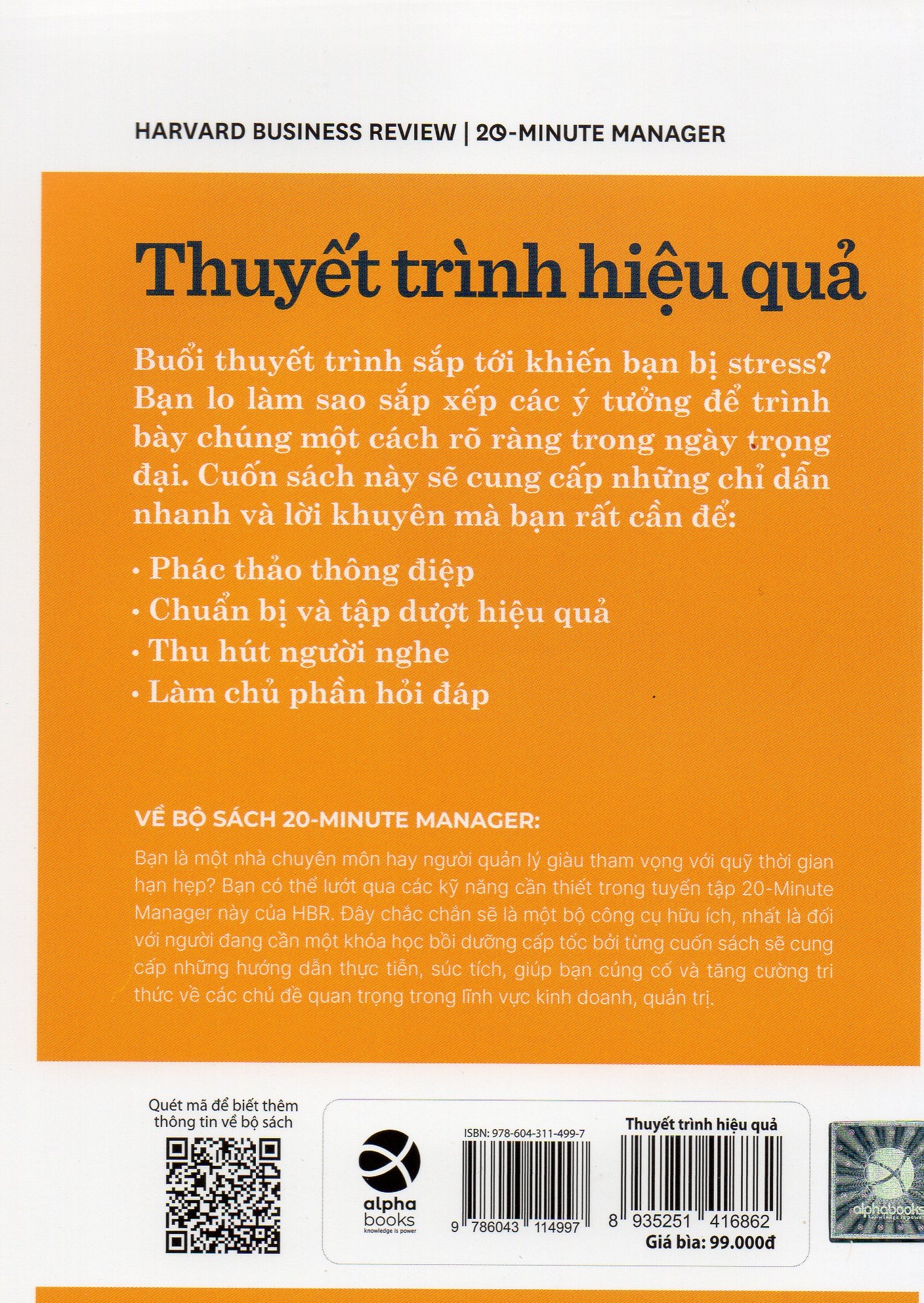 Mua tại TiktokSách HBR 20 Minute Manager - 20 Phút Thuyết Trình Hiệu Quả Nhà Xuất Bản : NXB Công Thương Nhà Phát Hành : Công Ty TNHH Văn Hóa Đông Tây Năm Phát Hành : 2021 Tác Giả : Harvard Buiness Review Press Người Dịch : Lan Chi Số Trang : 125 Khổ : 12.7 x 17.8cm Trọng lượng : 500gr Buổi thuyết trình sắp tới khiến bạn bị stress? Bạn lo làm sao sắp xếp các ý tưởng để trình bày chúng một cách rõ ràng trong ngày trọng đại. Cuốn sách này sẽ cung cấp những chỉ dẫn nhanh và lời khuyên mà bạn rất cần để: (1) Phác thảo thông điệp, (2) Chuẩn bị và tập dượt hiệu quả, (3) Thu hút người nghe (4) Làm chủ phần hỏi đáp (Q&A).