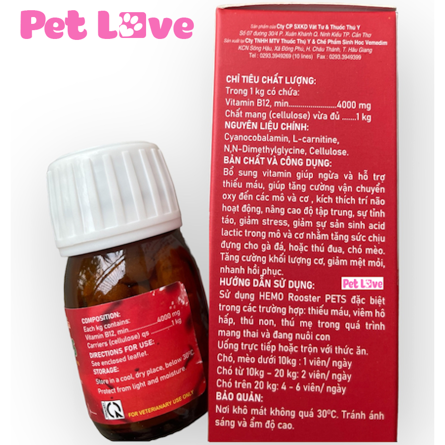 Hemo rooster - Bổ sung vitamin cho gà, thú đua, thú cưng, giúp tăng cơ, bền sức, nhanh hồi phục THÀNH PHẦN: Trong 1 kg có chứa: Vitamin B12, mg Chất mang (cellulose) vừa