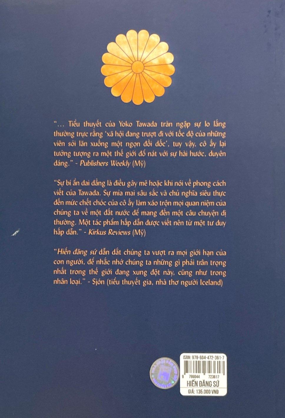 Tên tuổi của Yoko Tawada được độc giả Việt Nam biết tới qua cuốn Mắt trần, nay Nhà xuất bản Phụ nữ Việt Nam tiếp tục giới thiệu Hiến đăng sứ – một tác phẩm sẽ dẫn độc giả vào thế giới của Yoko Tawada với những huyễn hoặc, lạ lẫm, những ẩn dụ và hiện thực lạ lùng bậc nhất.