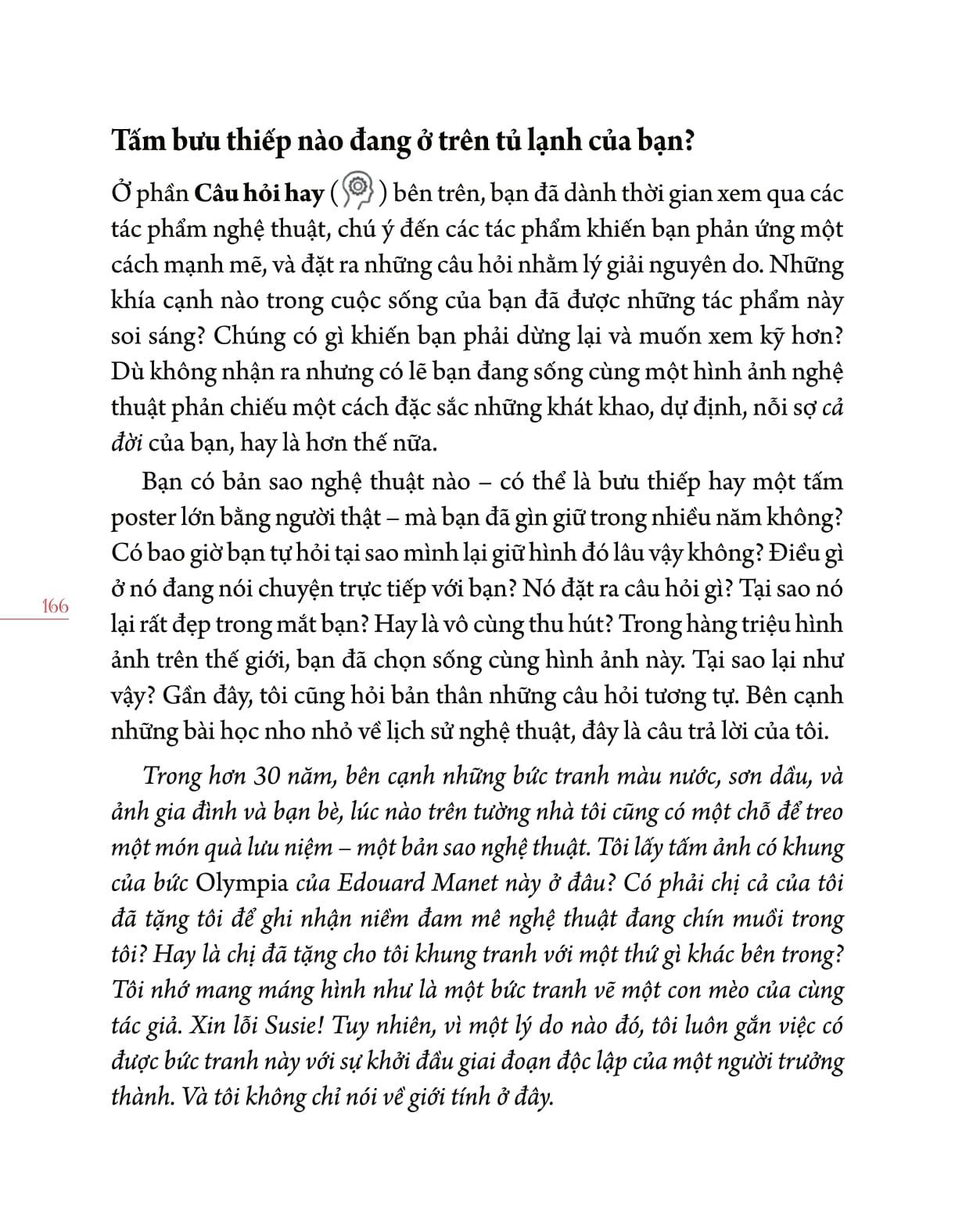 Quyển sách này cho bạn những hiểu biết cơ bản nhưng sâu sắc về mỹ thuật (đã được bạn "tiêu hóa" qua quá trình đọc và suy ngẫm). Để lần sau khi được mời dự triển lãm mỹ thuật, bạn sẽ tự tin dự và trao đổi cùng tác giả về cảm nhận của chính mình.