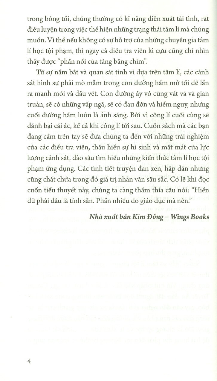Từ sự nắm bắt và quan sát tinh vi dựa trên tâm lí, các cảnh sát hình sự phải mò mẫm trong con đường hầm mờ tối để lần ra manh mối và dấu vết. Con đường ấy vô cùng vất vả và gian truân, sẽ có những vấp ngã, sẽ có đau đớn và hiểm nguy, nhưng cuối đường hầm luôn là ánh sáng. Bởi vì công lí cuối cùng sẽ đánh bại cái ác, kể cả khi công lí tới sau. Cuốn sách mà các bạn đang cầm trên tay sẽ đưa chúng ta đến với những trải nghiệm của các điều tra viên, thấu hiểu sự hi sinh và mất mát của lực lượng cảnh sát, đào sâu tìm hiểu những kiến thức tâm lí học tội phạm ứng dụng. Các tình tiết truyện đan xen, hấp dẫn nhưng cũng chất chứa trong đó giá trị nhân văn sâu sắc. Có lẽ khi đọc cuốn tiểu thuyết này, chúng ta càng thấm thía câu nói: “Hiền dữ phải đâu là tính sẵn. Phần nhiều do giáo dục mà nên.”