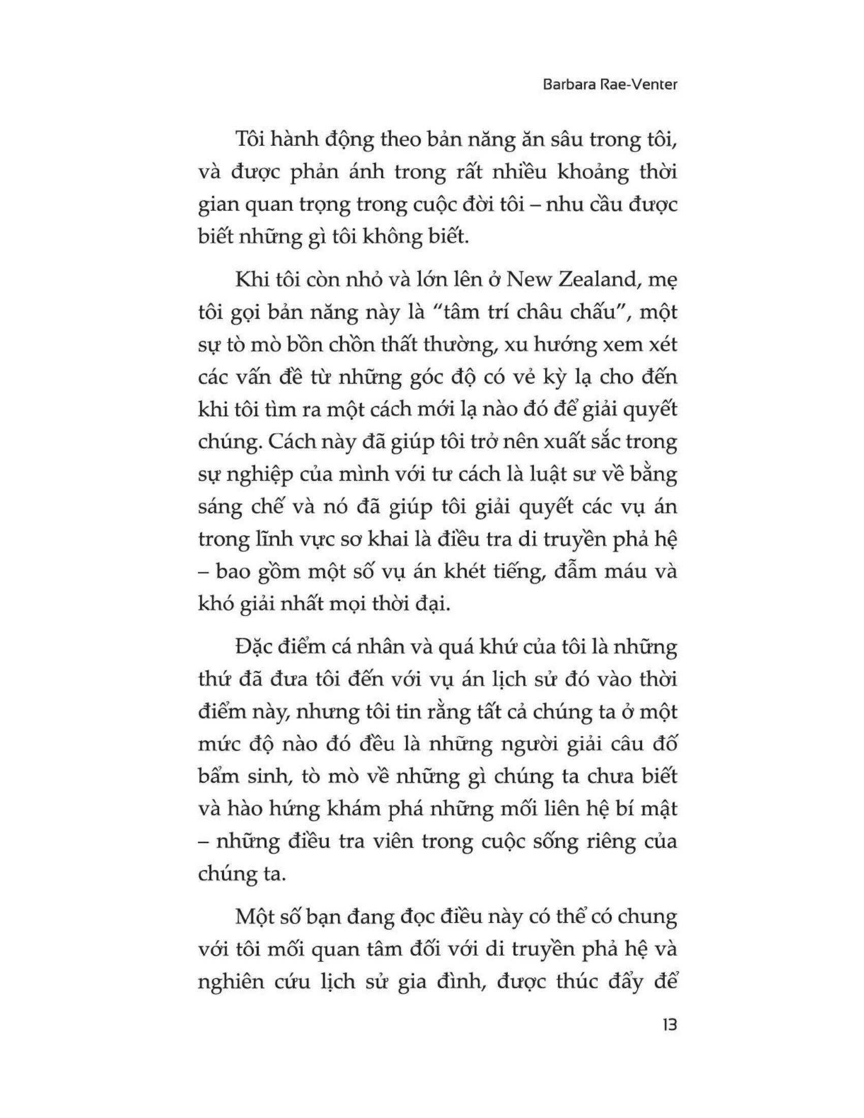 • Vụ án bế tắc 20 năm được giải quyết trong 48 giờ. Vụ án không có lời giải 43 năm nay được phá trong 63 ngày. …Tất cả sẽ được phá giải trong cuốn sách này. Cuốn sách sẽ ghi lại cả niềm phấn khích của khoảnh khắc khám phá, lẫn chiều sâu của cảm xúc đọng lại xung quanh những vụ án man rợ có thật dựa trên trải nghiệm của chính tác giả. Đó là câu chuyện về sự tò mò, những phát minh và sáng tạo không ngừng, và về những con người cố gắng trả lời những câu hỏi cơ bản nhất về bản thân: Chúng ta thuộc về đâu? Và chúng ta có thực sự là người như chúng ta nghĩ không? Về tác giả: Barbara Rae-Venter là một nhà phả hệ di truyền điều tra người Mỹ gốc New Zealand, nhà hóa sinh và luật sư bằng sáng chế đã nghỉ hưu. Bà nổi tiếng với công việc giúp FBI điều tra các vụ án tội phạm bằng mã gen DNA. Công việc điều tra đã giúp bà nằm trong vị trí trong danh sách 100 người có ảnh hưởng nhất của Time vào năm 2019 và được tạp chí Nature công nhận là một trong "10 người quan trọng trong khoa học năm 2018."