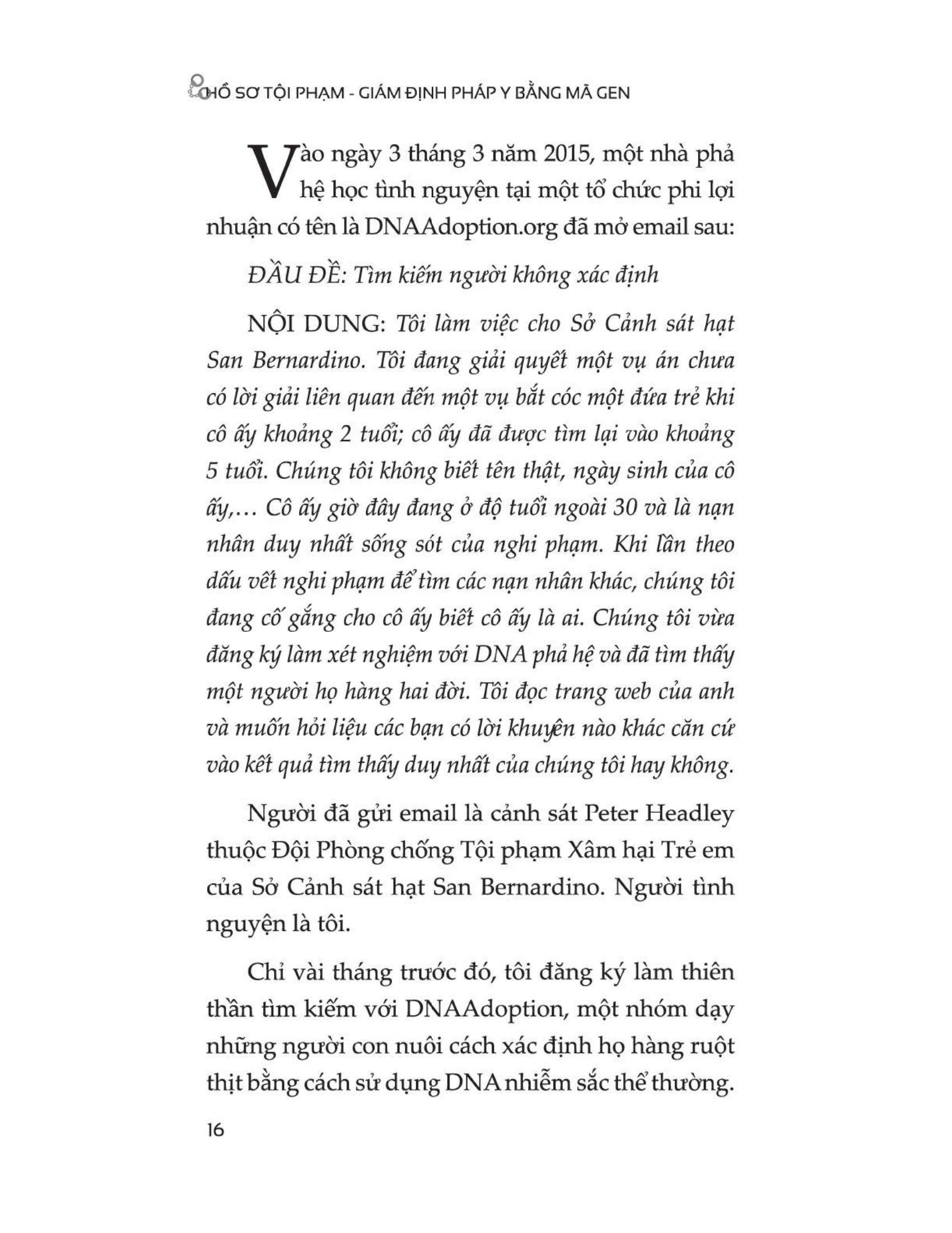Hồ Sơ Tội Phạm - Giám Định Pháp Y Bằng Mã Gen “Một kiệt tác tội phạm CÓ THẬT được viết bởi một bậc thầy phá án lạnh lùng. Công việc điều tra DNA của Barbara Rae-Venter đã cách mạng hóa cách thức cơ quan thực thi pháp luật săn lùng những kẻ giết người hàng loạt.” Cơ thể bạn được tạo thành từ 30 nghìn tỉ tế bào và bạn thải ra khoảng 500 triệu tế bào mỗi ngày. Trên da đầu của bạn có khoảng 250 nghìn sợi tóc và rụng khoảng 50 đến 100 sợi tóc mỗi ngày. Bạn luôn để dại dấu vết ở bất kỳ nơi nào bạn lướt qua. Và nếu có đủ thời gian, tôi sẽ tìm thấy bạn. Hay nói cách khác, tôi biết rõ bạn là ai. Cuốn sách “HỒ SƠ TỘI PHẠM – GIÁM ĐỊNH PHÁP Y BẰNG MÃ GEN” sẽ dẫn dắt người đọc vào một hành trình sống động qua nhiều vụ án mà chính tác giả đã giải quyết, thường bắt đầu với ít hơn một mẫu DNA.