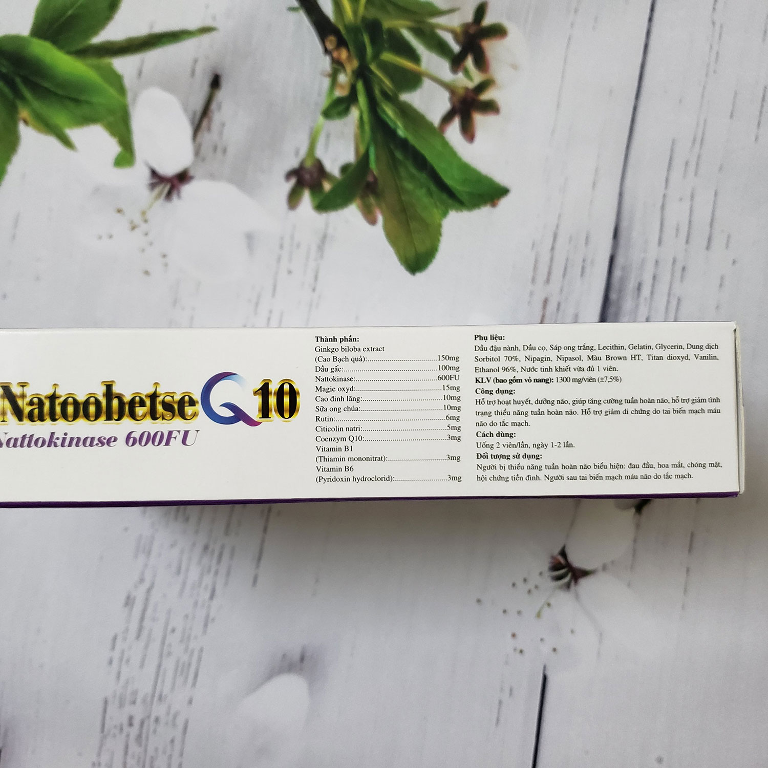 Mua tại TiktokHoạt huyết dưỡng não Natoobetse Q10 giúp tăng cường tuần hoàn não, giảm tình trạng thiếu máu tuần hoàn não - Hộp 30 viên Thành phần: Ginko biloba extract ( Cao bạch quả ) Dầu gấ N Magie Cao đinh lă 10mg Sữa ong chú 10mg R 6mg Citicolin 5mg Coenzyme Q 3mg Vitamin B1 ( Thiamin mononitrat ) 3mg Vitamin B6 ( Pyridoxin hydrochloric ) 3mg Phụ liệu : Dầu đậu nành, Dầu cọ, Sáp ong trắng, Lecithin, Gelatin, Glycerin, Dung dịch Sorbitol 70%, Nipasol, Màu Brow HT, Titan dioxyd, Vanilin, Ethanol 96%, Nước tinh khiết vừa đủ 1 viên. Công dụng: Hỗ trợ hoạt huyết, dưỡng não, giúp tăng cường, tuần hoàn máu não, hỗ trợ giảm tình trạng thiếu máu tuần hoàn não Hỗ trợ giảm di chứng tai biến mạch máu não do tắc mạch. Ưu điểm sản phẩm: