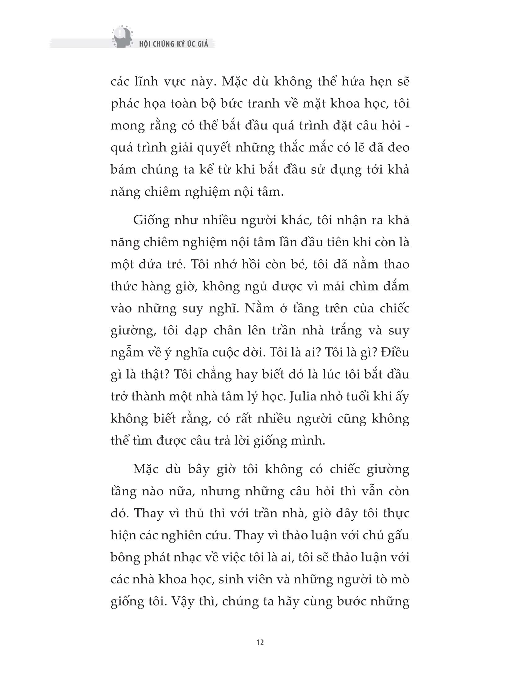 - Bạn nghĩ rằng mọi ký ức của m.ình đều hoàn toàn chính xác? Những lỗi trong quá trình ghi nhớ của chúng ta diễn ra rất phổ biến. Mọi người thường nghĩ rằng bộ não của chúng ta ghi nhớ như một thứ giống như một máy ghi hình - ghi lại và lưu trữ mọi thứ xảy ra với độ chính xác tuyệt đối . Trong thực tế, rất dễ mắc các lỗi trong việc ghi nhớ. Nhiều người có thể vô cùng tự tin rằng trí nhớ của họ chính xác, nhưng thực tế đáng buồn là, trí nhớ không phải bản ghi chép quá khứ chính xác và hoàn hảo như chúng ta vẫn tưởng. Ký ức liên tục biến mất. Ta bước vào phòng và ngay lập tức quên mất m.ình vào đây để làm gì, hoặc ta đột nhiên không thể nhớ ra tên của một người mà m.ình đã gặp nhiều lần trước đó. Vậy hãy thử tưởng tượng, những hậu quả nghiêm trọng nào có thể bị kéo theo, nếu như bộ nhớ đầy thiếu sót của ta không những quên, mà còn có nguy cơ bóp méo thông tin và thêu dệt nên một ký ức hoàn toàn mới - ngay cả khi chuyện đó chưa từng xảy ra? Hội chứng ký ức giả là cuốn sách tổng hợp những nghiên cứu mới nhất về não bộ và trí nhớ: cơ chế ghi nhớ của não bộ, các yếu tố hình thành nên những ký ức không có thật và một số nguyên tắc để cải thiện trí nhớ. Trong cuốn Hội chứng ký ức giả, nhà tâm lý học pháp y, đồng thời là chuyên gia về trí nhớ, Tiến sĩ Julia Shaw đ.ã sử dụng những nghiên cứu mới nhất cho thấy cách bộ não của chúng ta bóp méo ký ức đúng đắn và tạo ra những ký ức về sự kiện không có thực. Cuốn sách đưa ra các dẫn chứng cho người đọc hiểu rằng, ký ức giả không chỉ ảnh hưởng tới chính bản thân người sở hữu ký ức đó, mà còn ảnh hưởng tới xã hội như thế nào: Ký ức giả có thể khiến chúng ta tự tin thái quá vào khả năng ghi nhớ của chính m.ình, khiến cảnh sát bỏ tù không ít người vô tội, thậm chí có thể khiến một người nổi tiếng tiêu tan sự nghiệ Không chỉ có vậy, cuốn sách còn tiết lộ cách để cải thiện trí nhớ thông qua việc thừa nhận ký ức có nguy cơ bị sai sót. Từ đó, người đọc không chỉ sở hữu những kiến thức về khoa học trí nhớ, mà còn biết thêm nhiều phương pháp giúp tăng cường khả năng lưu giữ thông tin chính xác và hiệu quả. Lôi cuốn và đầy bất ngờ, Hội chứng ký ức giả chính là một người bạn đồng hành trên con đường khám phá bản thân chúng ta dựa trên cơ sở khoa học về trí nhớ. Cuốn sách này sẽ giúp chúng ta hiểu hơn về cách ghi nhớ của não bộ, về tính đúng đắn của những ký ức mà ta sở hữu, khiến bạn phải đặt câu hỏi rằng bạn thực sự hiểu bản thân m.ình đến mức nào. Về tác giả Tiến sĩ Julia Shaw là một giảng viên và nhà nghiên cứu kỳ cựu của Trường Luật và Khoa học Xã hội, Đại học London South Bank, đồng thời là một trong số ít chuyên gia trên thế giới thực hiện nghiên cứu về những sai sót trí nhớ phức tạp liên quan đến các sự kiện cảm xúc cá nhân - hay còn gọi là những “ký ức sống động nhưng hoàn toàn không có thật”. Tiến sĩ Shaw xuất bản nhiều bài viết khoa học trên các tạp chí học thuật quốc tế, xây dựng giáo trình, thường xuyên cộng tác với tạp chí khoa học nổi tiếng Scientific American, thỉnh giảng và tham gia thuyết trình tại các hội thảo trên khắp thế giới. Cô cũng giảng dạy các lớp ở bậc đại học và sau đại học, đồng thời đã thắng hai giải thưởng dạy học xuất sắc.