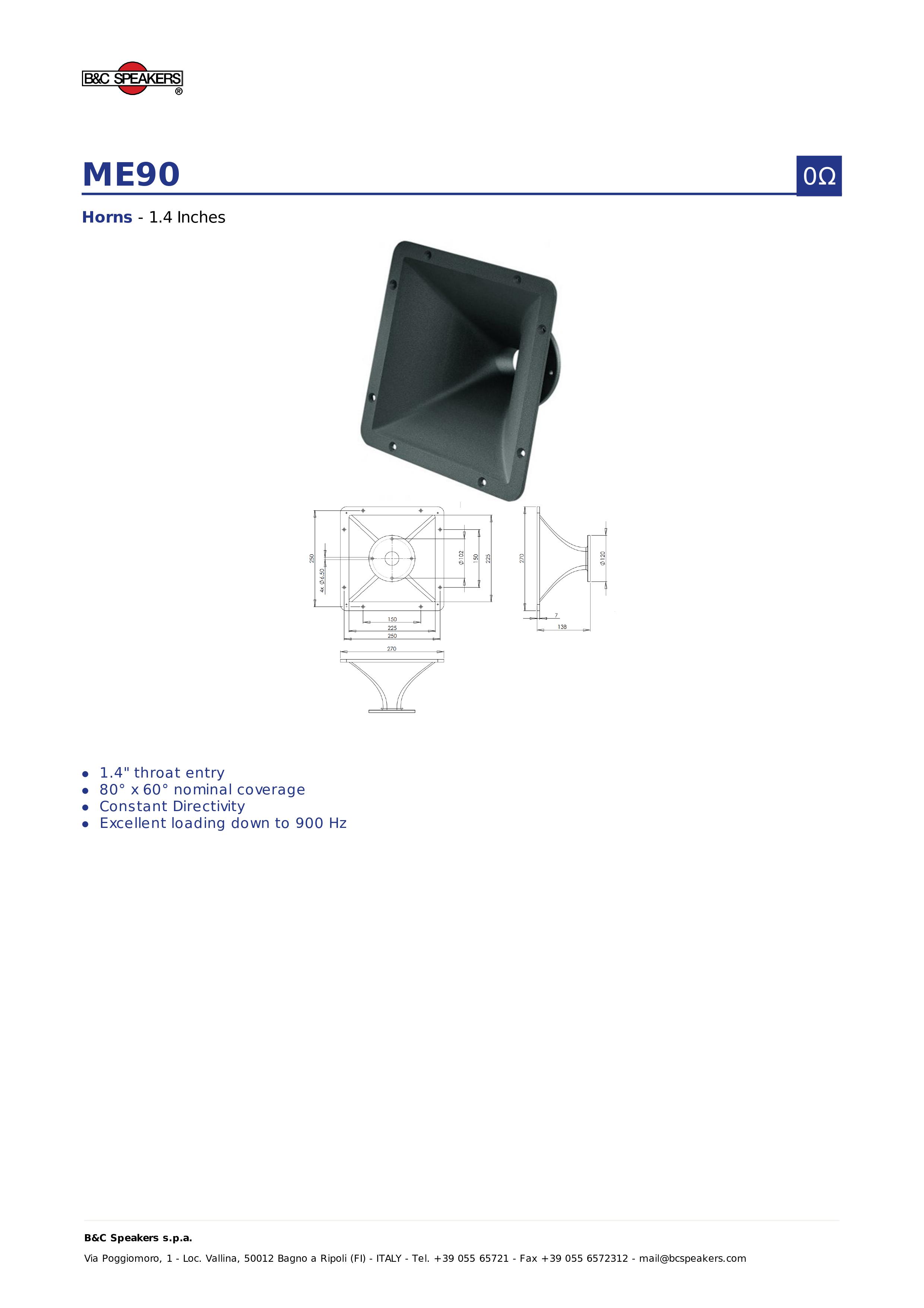 HỌNG LOA TREBLE B&C SPEAKERS ME90 Họng 1.4 (36mm) Độ phủ ngang: 80° Độ phủ dọc: 60° Tải xuống được tới 900Hz Khối lượng: 1.4 kg Kích thước: 270 x 270 x138 mm