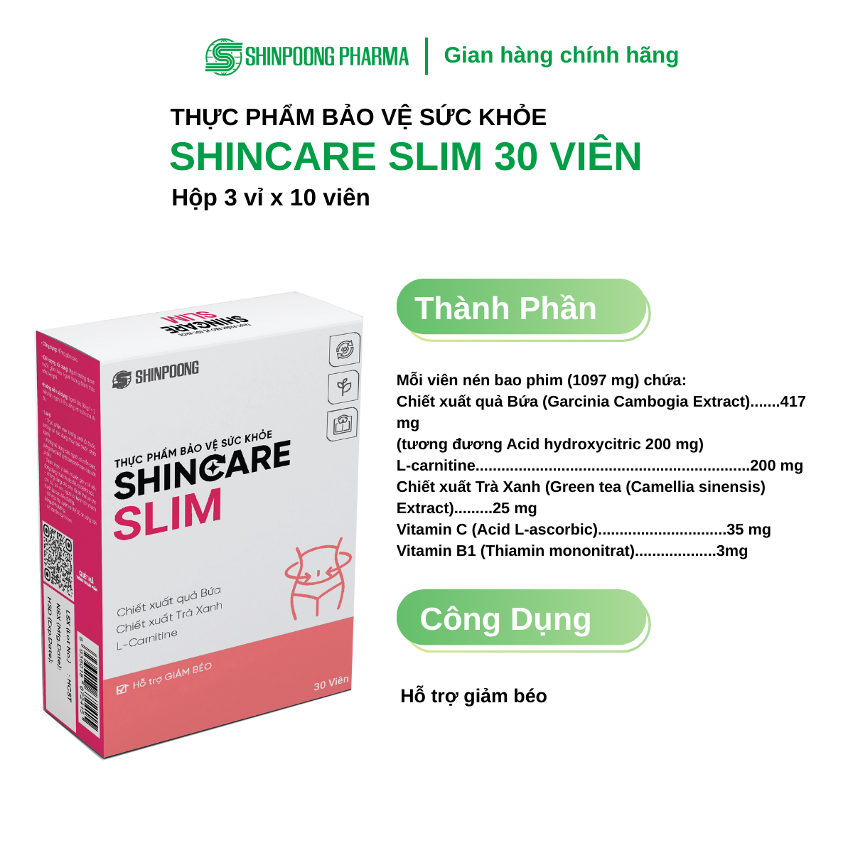 Mua tại TiktokTHỰC PHẨM BẢO VỆ SỨC KHỎE: SHINCARE SLIM THÀNH PHẦN Mỗi viên nén bao phim (1097 mg) chứa: Chiết xuất quả Bứa (Garcinia Cambogia Extract) 417 mg (tương đương Acid hydroxycitric 200 mg) L-carnitine 200 mg Chiết xuất Trà Xanh (Green tea (Camellia sinensis) Extract) 25 mg Vitamin C (Acid L-ascorbic) 35 mg Vitamin B1 (Thiamin mononitrat) 3ng QUY CÁCH ĐÓNG GÓI Hộp 3 vỉ x 10 viên CÔNG DỤNG Hỗ trợ giảm hấp thu chất béo, kiểm soát cân nặng. ĐỐI TƯỢNG SỬ DỤNG Người trưởng thành muốn giảm hấp thu chất béo, kiểm soát cân nặng. Người trưởng thành thừa cân, béo phì. CÁCH DÙNG Người lớn: Uống 1 – 2 viên/lần, ngày 2 lần, uống với nước sau khi ăn. BẢO QUẢN Trong bao bì kín, ở nơi khô, tránh ánh sáng trực tiếp, nhiệt độ dưới 30ºC. HSD 36 tháng kể từ ngày sản xuất. LƯU Ý