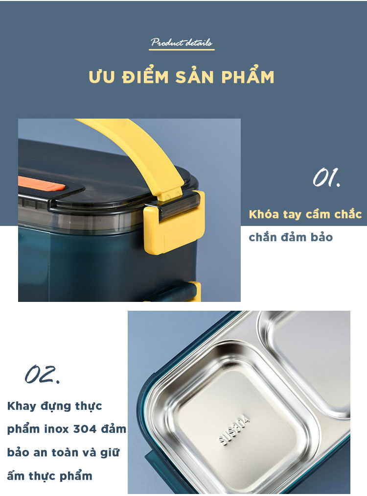 ĐẶC ĐIỂM NỔI BẬT - Hộp có dung tích 1000ml chia 3 ngăn, phân biệt từng món thuận tiện, thoải mái đựng cơm và thức ăn mang đi học, đi làm. - Làm bằng chất