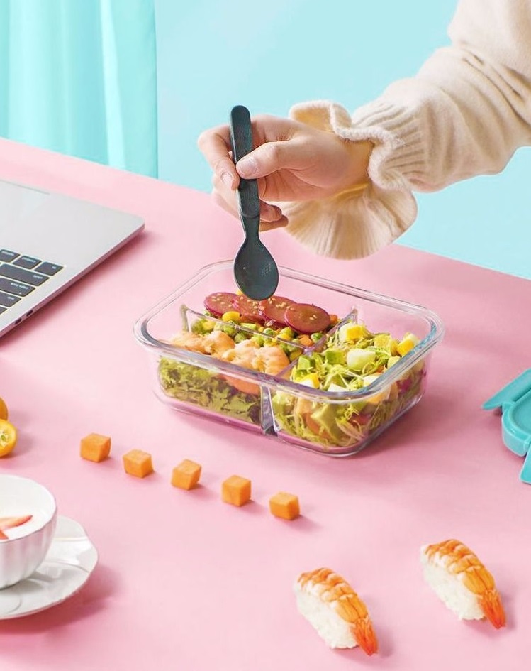ĐẶC ĐIỂM NỔI BẬT - Gồm 2 hộp thuỷ tinh đựng cơm mang đi học đi làm tiện lợi: - Hộp chia 3 ngăn dung tích 1000ml, có đi kèm bộ đũa thìa INOX, an