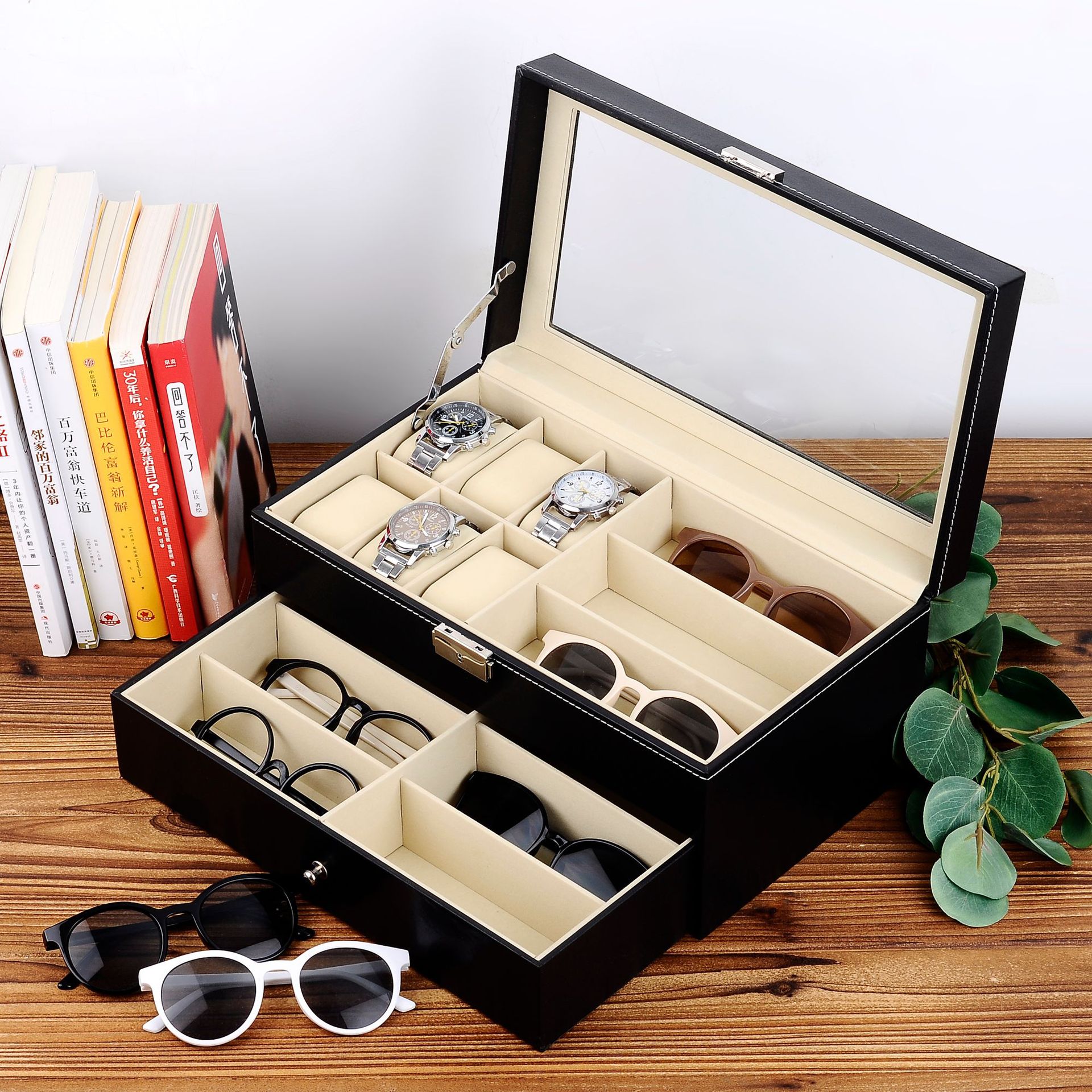 ✨Hộp Đựng Đồng Hồ Và Mắt Kính 2 Tầng SAIKE SAIKE S609 Vỏ Da Màu Đen